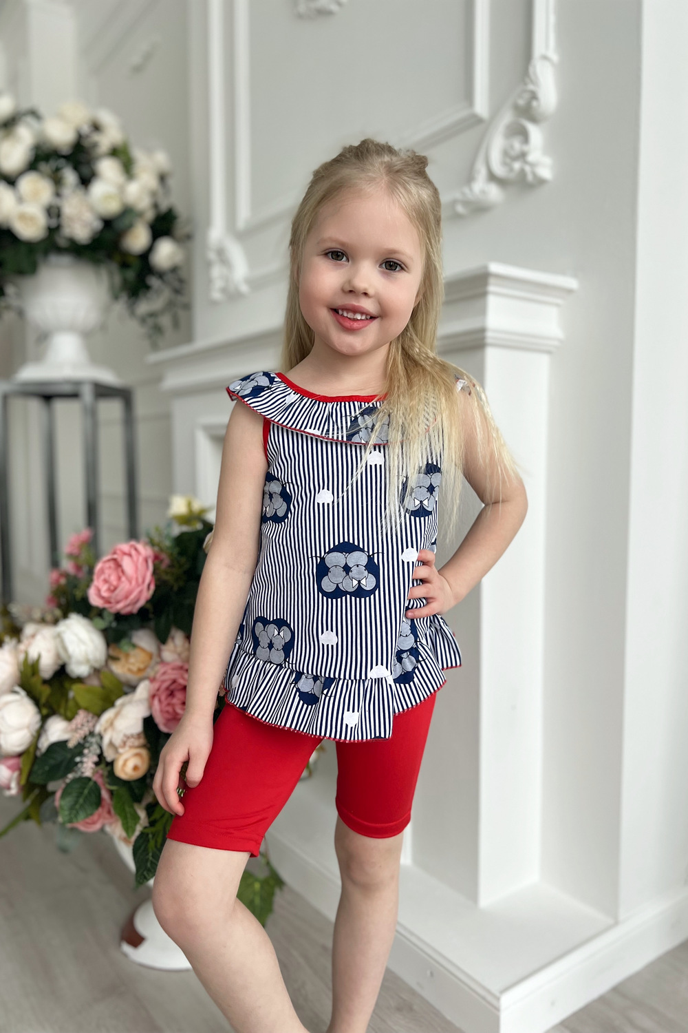 Маечка для девочки, по горловине и низу изделия оборка, на спинке завязки.