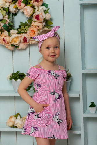 Майка детская летняя для девочек, свободного покроя на тонких бретелях, с накладным кармашком на полочке. По горловине и рукавам настрочена декоративная ажурная резинка. Все срезы в изделии обработаны декоративной краеобметачной строчкой.