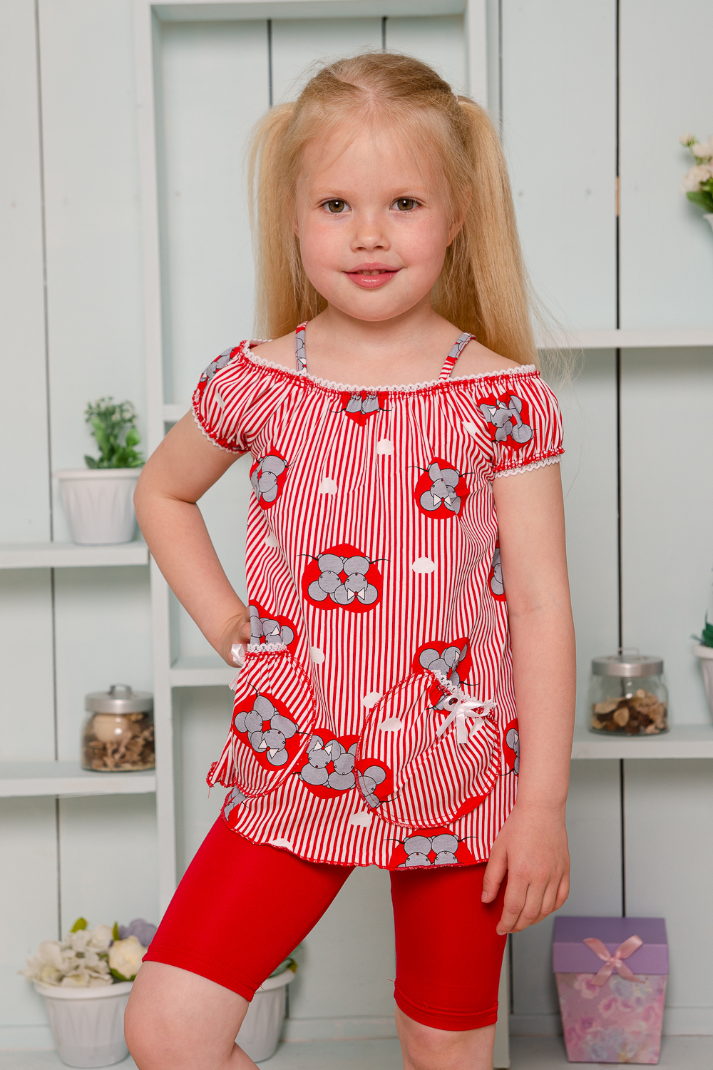 Майка детская летняя. Свободного А-силуэта на тонких бретелях. С двумя декоративными кармашками, на которых настрочены бантики из атласной ленты. Горловина и рукава собраны на кружевную резинку. Все срезы в изделии обработаны декоративной краеобметочной строчкой.
