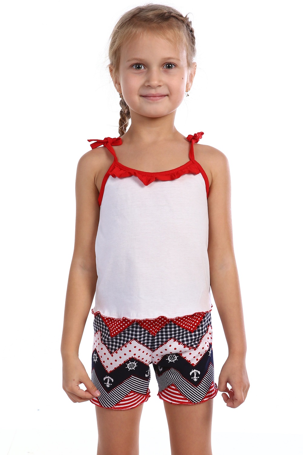 Пижама из кулирки майка + шорты. Лямки из окантовки на завязках, у горловины рюши. Короткие шорты.Товар соответствует описанию