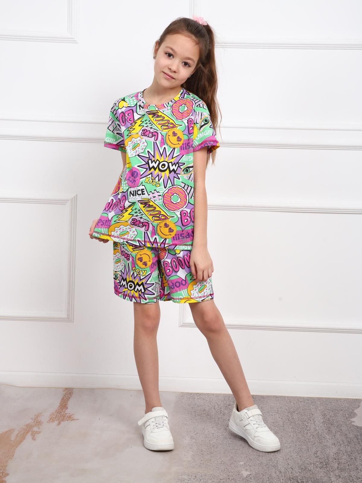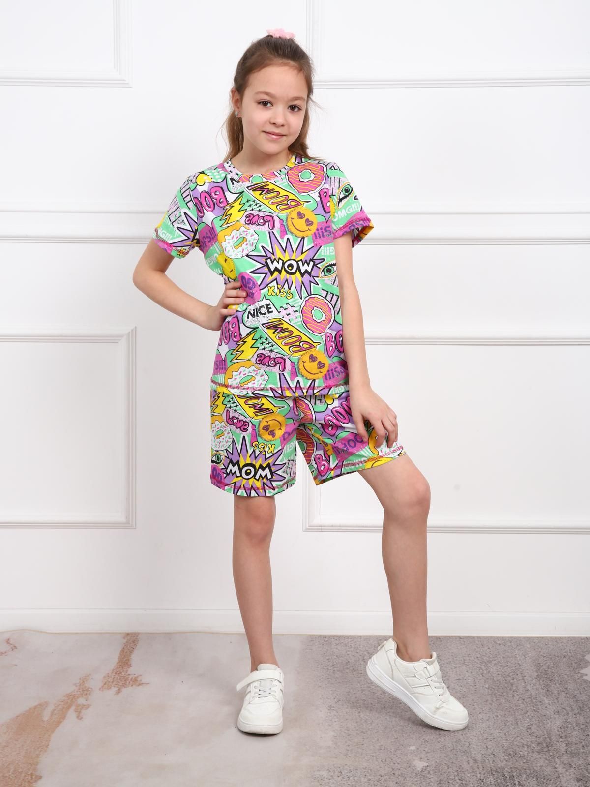 Костюм для девочки из хлопкового полотна состоит из футболки свободного кроя и длинных широких шорт.