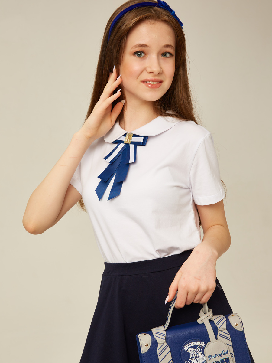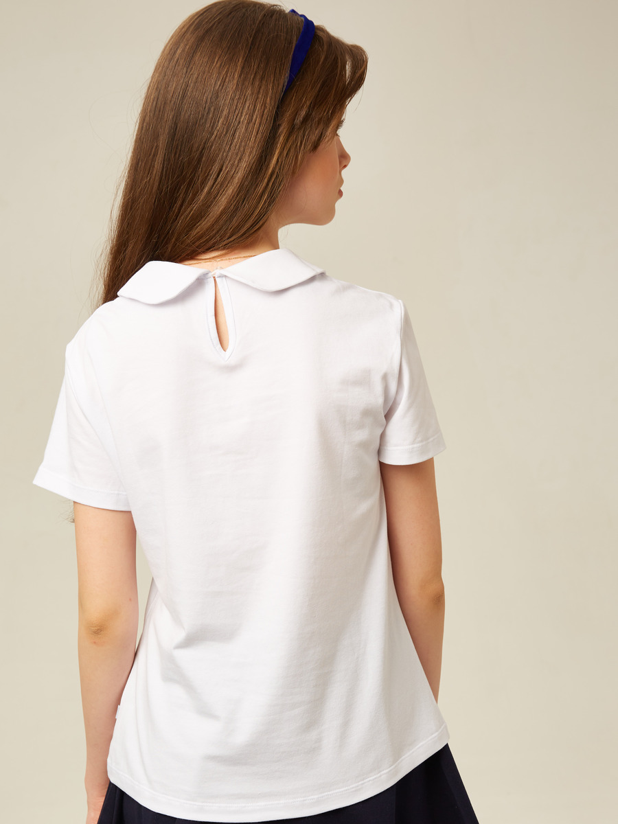 Блузка для девочки из трикотажного полотна, прилегающего силуэта, с короткими втачными рукавами, воротник отложной с закругленными концами. Застежка сзади на пуговицу. Блузка декорирована жабо-галстук