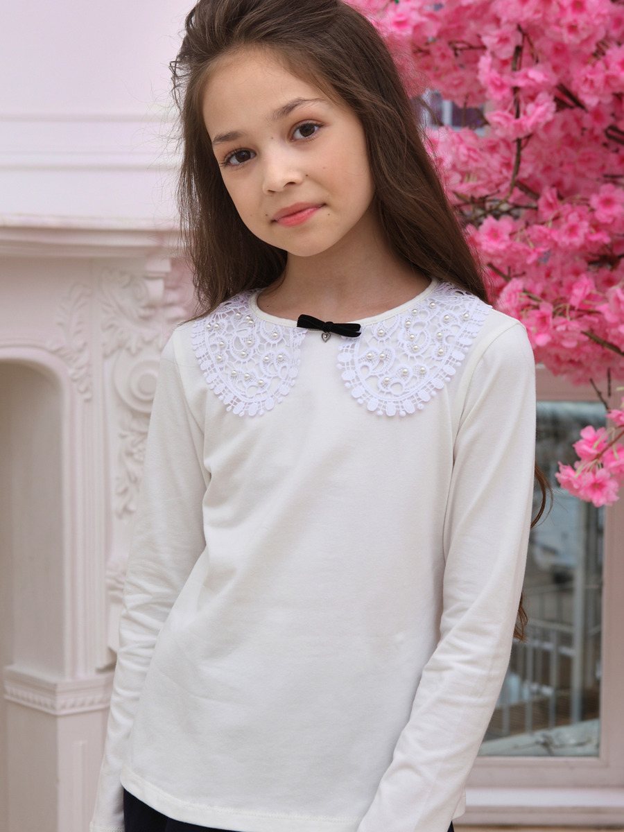 Блузка для девочки из трикотажного полотна с длинным рукавом, прилегающего силуэта средней длины. Вырез горловины округлый, декорирован вязанным ажурным воротником, по центру декоративный бантик.