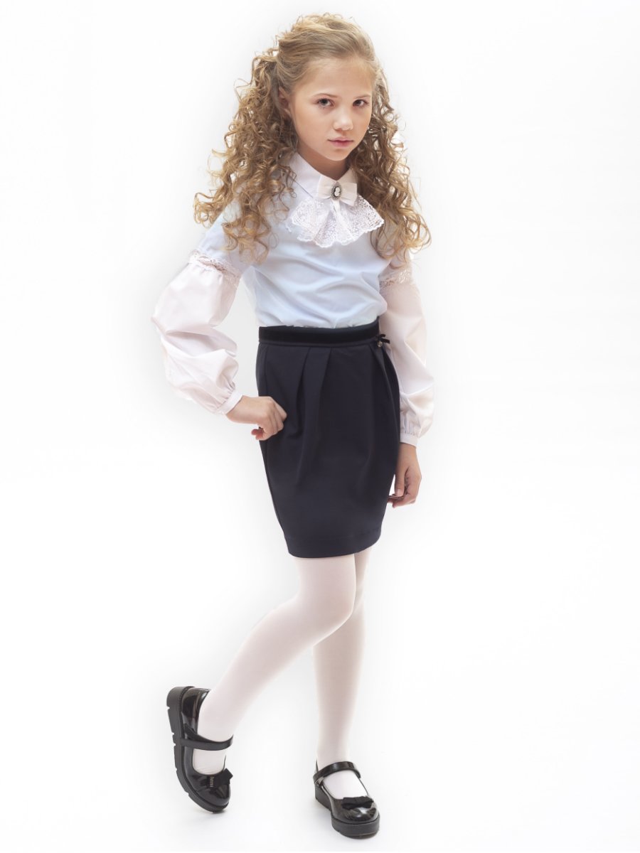 Блуза полуприлегающего силуэта из эластичного сорочечного полотна. Нижняя часть втачного рукава выполнена со сборкой и украшена кружевом. Горловина оформлена со стойкой и украшена декоративным бантом.