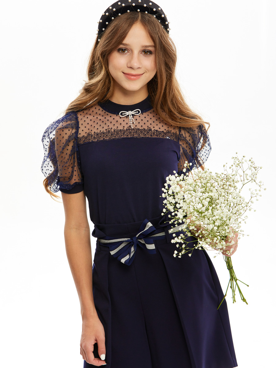 Блуза трикотажная для девочки с короткими втачными рукавами, присборенными по окату. Кокетка полочки выполнена из прозрачной сетки, шов которой декорирован кружевом, горловина блузки круглая с воротничком стойкой, в комплекте есть брошь.