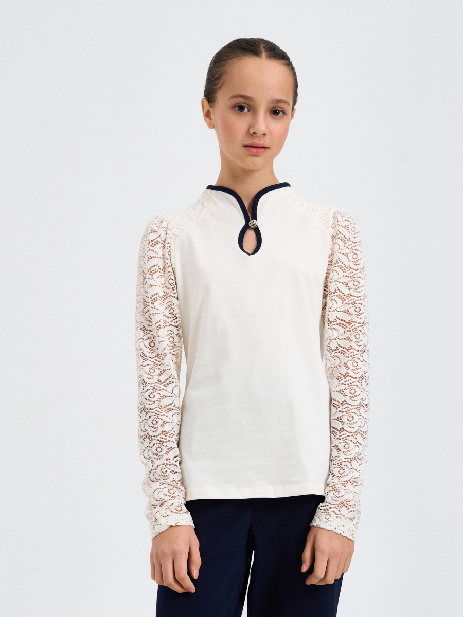 Блуза трикотажная с длинными рукавами, присборенными по окату, цельнокроеный воротник-стойка. Рукава, кокетка из кружевного полотна.