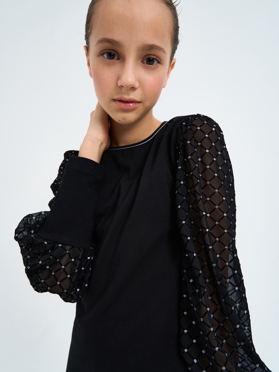 Блузка из кулирной глади с лайкрой прилегающего силуэта, длинный рукав на широкой манжете, круглая горловина.Рукава пышные из прозрачного сетчатого полотна с принтом флок. черный