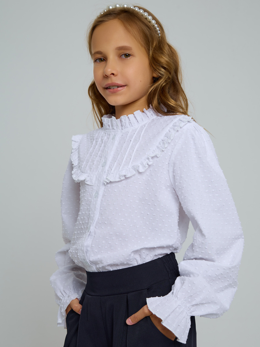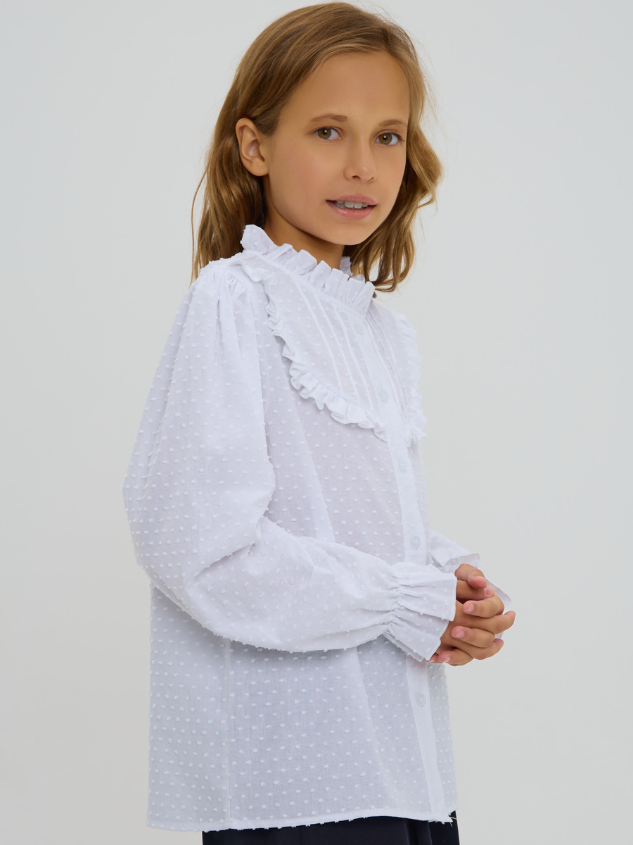 Натуральный тонкий батистовый хлопок с фактурными элементами (мушка) цвета белый. Блуза с лучиками на кокетке и оборкой по краю кокетки и горловине. Понизу рукава волан.