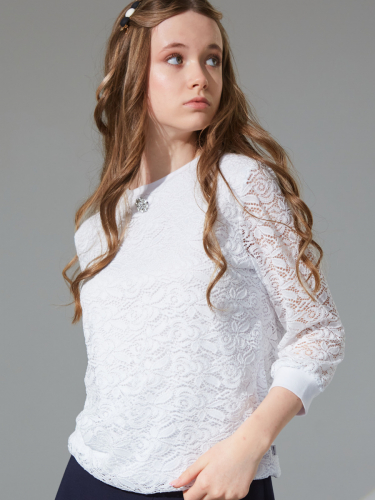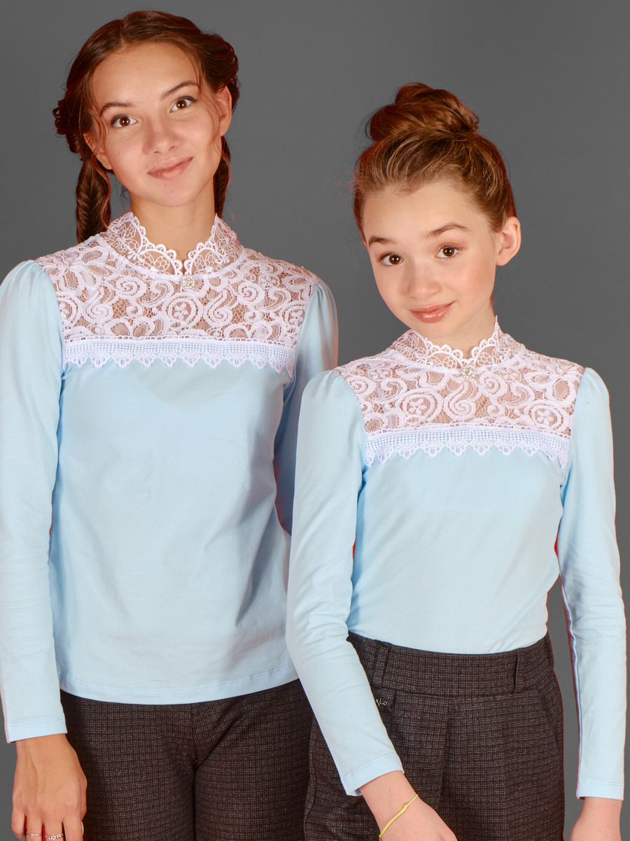 Блуза прилегающего силуэта из кулирки. Кокетка полочки оформлена ажурным кружевом, круглая горловина с декоративной стойкой и застежкой на петлю пуговицу по спинке. Блуза украшена декором. голубой