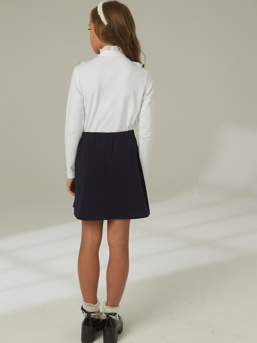 Коллекция школа 2024. Трикотажная Блузка из хлопковой кулирки с дабавлением эластана качества пенье пл.180 гр/м2. Блузка для девочки приталенного силуэта для повседневной носки с втачным длинным рукавом зауженным к низу. Низ рукава и низа изделия обработан эластичным швом в подгибку с нижним застилом. Блузка с манишкой и цельновыкроенной планкой из текстиля и застежкой на пуговацах, воротник стойка. На воротнике рюша и вокруг манишки жабо из жатого шефона, окантованной край атласной контрастной косой бейкой. Декорочивный бант.
