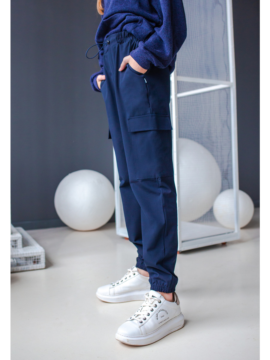 Однотонные брюки из текстиля, прямого силуэта, на притачном поясе с эластичной тесьмой и декоративным шнуром на фиксаторе спереди. Есть боковые и накладные карманы, манжеты на резиновой тесьме.
