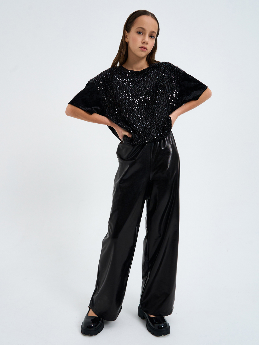 Брюки широкие, из материала диско. Пояс на резинке с отделочными строчками. черный