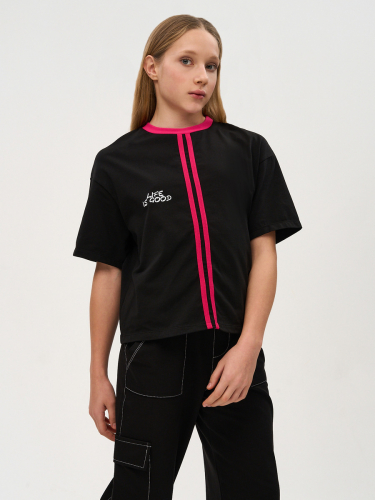 Футболка для девочки, свободного силуэта, со спущенной линией плеча и короткими рукавами. Горловина круглая, перед декорирован настрочными лампасами.
