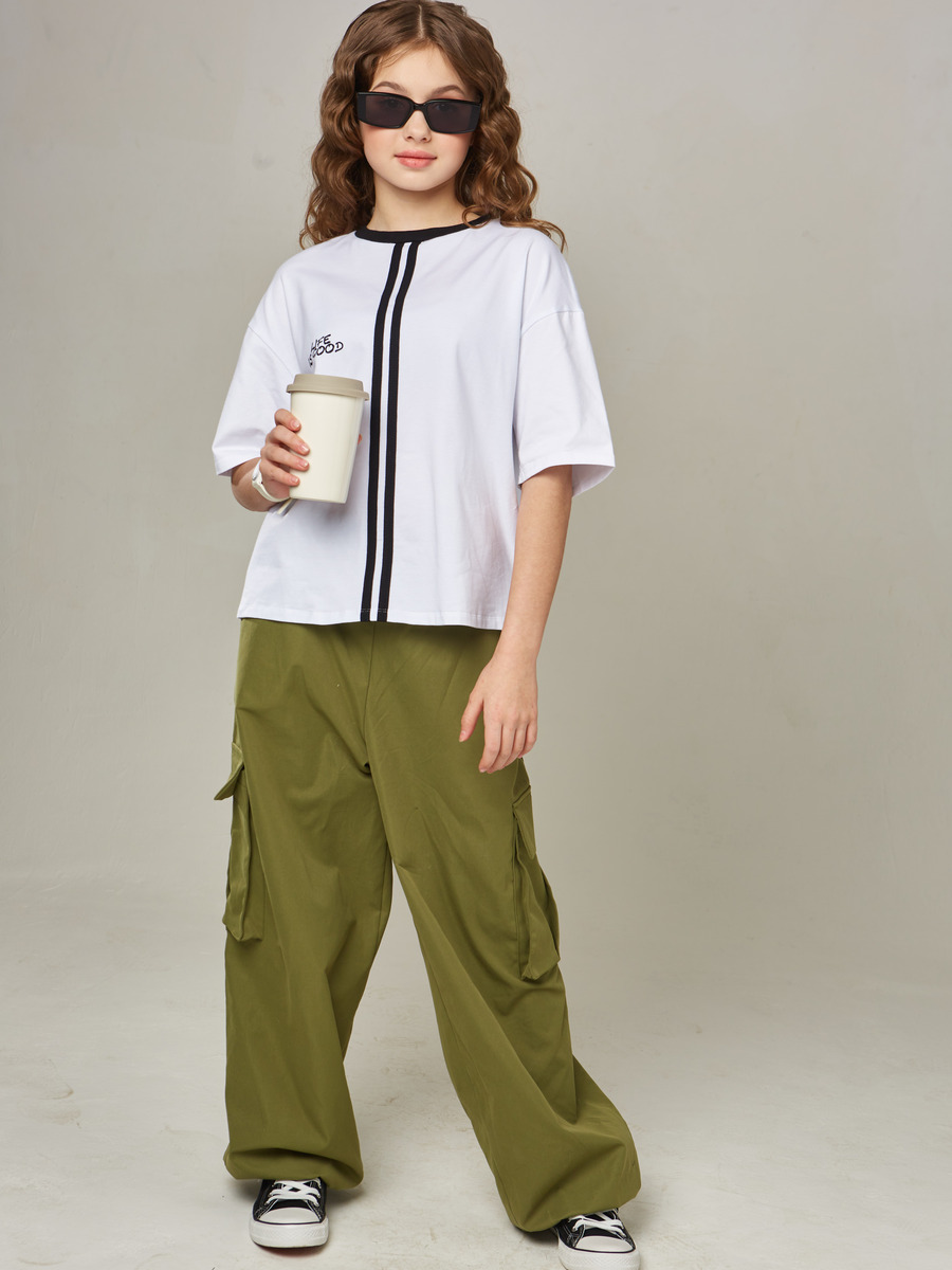 Футболка для девочки, свободного силуэта, со спущенной линией плеча и короткими рукавами. Горловина круглая, перед декорирован настрочными лампасами.