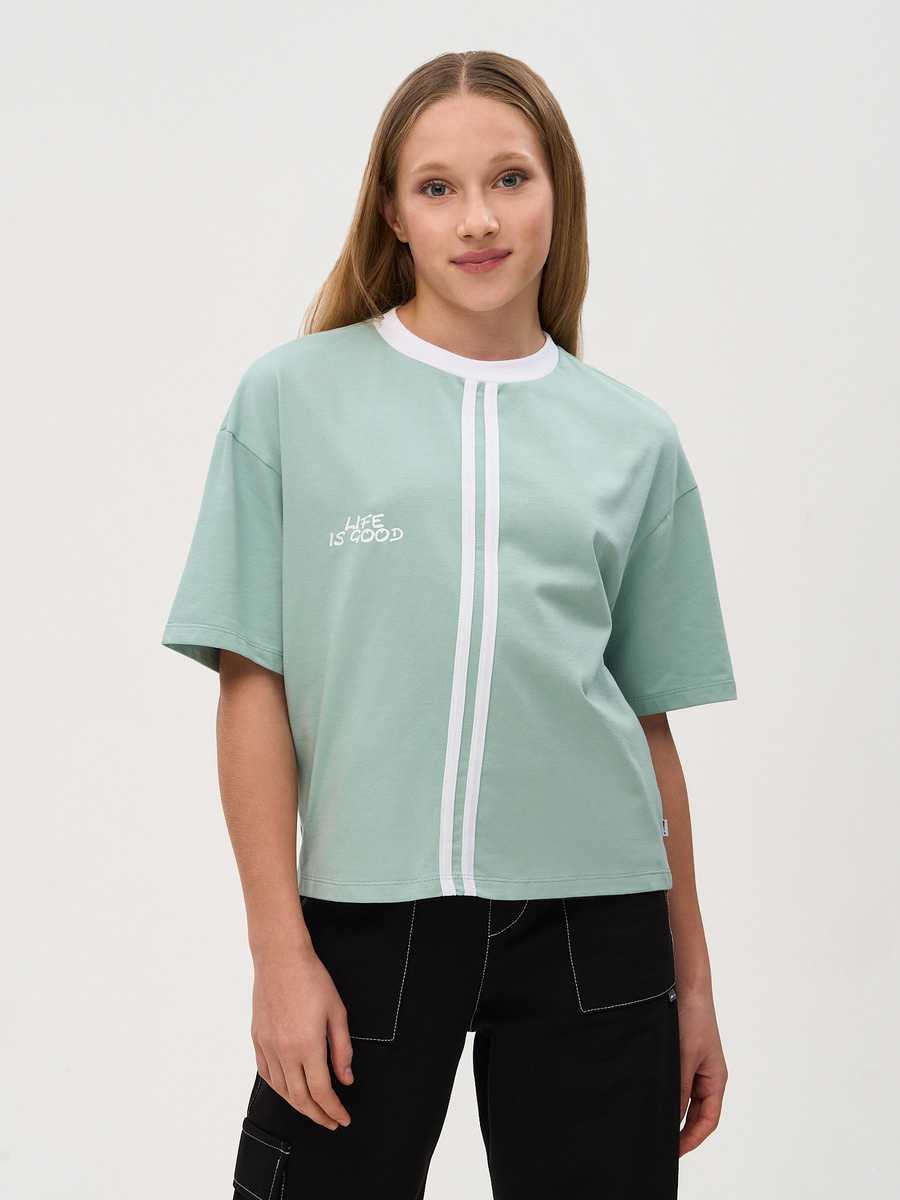 Футболка для девочки, свободного силуэта, со спущенной линией плеча и короткими рукавами. Горловина круглая, перед декорирован настрочными лампасами.