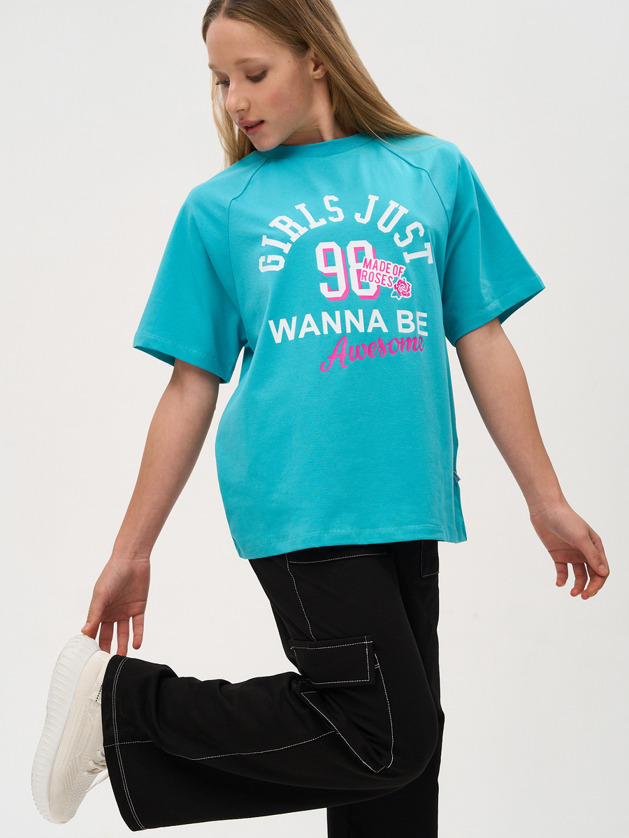 Низ изделия и руквов обработан эластичным швом в подгибку с нижним застилом, в левом боковом шве - фирменный флажок. На полочке износостойкий двухцветный принт с надписью на английском языке. Перевод:"Девушки просто хотят быть крутыми".