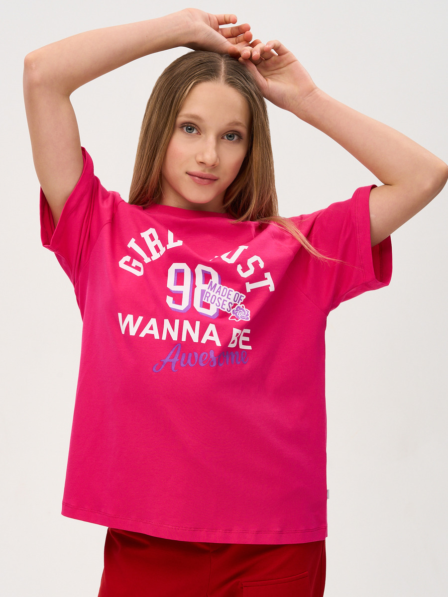 Низ изделия и руквов обработан эластичным швом в подгибку с нижним застилом, в левом боковом шве - фирменный флажок. На полочке износостойкий двухцветный принт с надписью на английском языке. Перевод:"Девушки просто хотят быть крутыми". фуксия