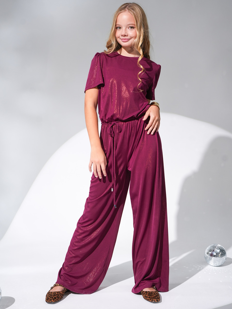 Комбинезон для девочки прямого силуэта из трикотажного полотна с напылением микроблеска. Рукава короткие "фонарик", с круглой горловиной и планкой, застежка сзади на "молнию". Брюки длинные, свободные. В поясе-эластичная тесьма-резинка, декоративный шнур-пояс зафиксирован по боковым швам на шлевки, на концах металлические наконечники. бордовый