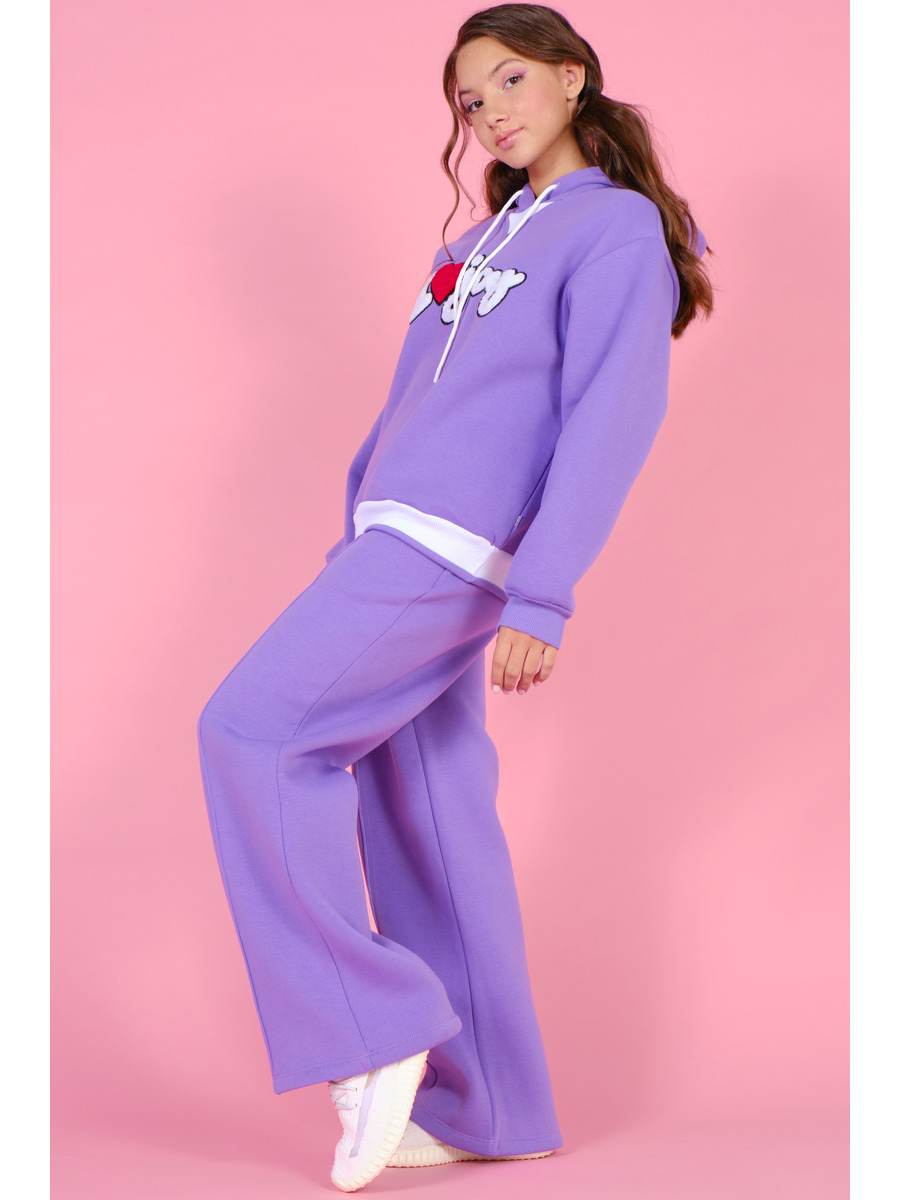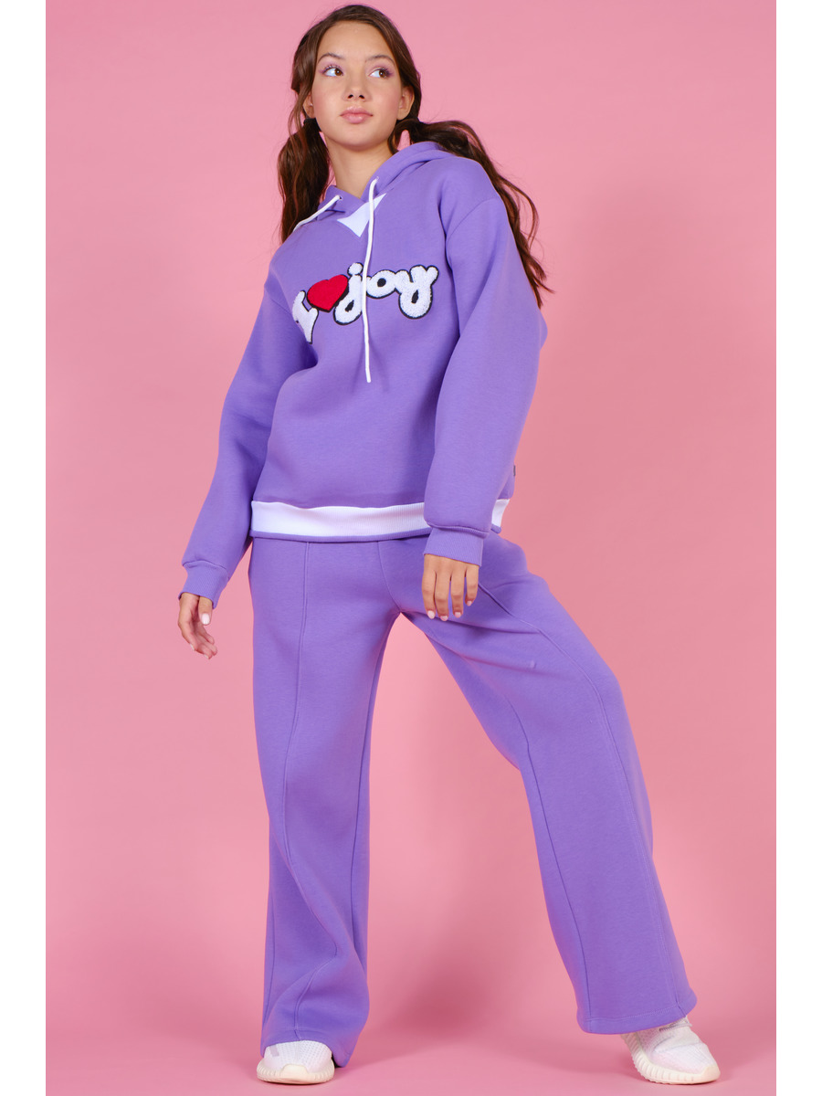 Костюм спортивный из футера с начесом.Толстовка оверсайз, спущенная линия плеча, длинный рукав на манжете, капюшон. Брюки свободные, эластичный пояс, боковые карманы, низ прямой. леденцово-фиалковый