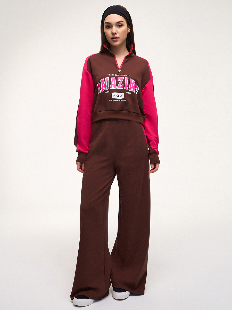 Костюм спортивный из футера с лайкрой: толстовка и брюки. Толстовка прямая, длинный рукав на манжете, воротник-стойка, застежка на короткую молнию. Брюки средней посадки, длинные, широкие к низу, эластичный пояс. Широкие вставки по боковым швам. Спереди принт. шоколадный
