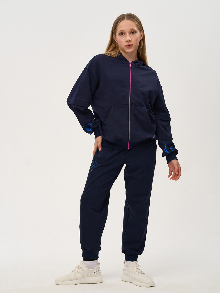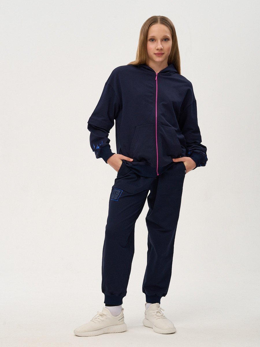 Костюм спортивный для девочки из премиального качественного хлопкового пенье футера 2-х нитки с лайкрой. Толстовка в японском стиле с капюшоном, застежка молния, карман "кенгуру", рукава с имитацией двухслойности, на манжетах, низ на поясе. Брюки зауженные на манжетах, пояс на резинке, карманы в швах. Комплект декорирован принтами на спинке, рукавах и правой передней половинке брюк в стиле анимэ. темно-синий