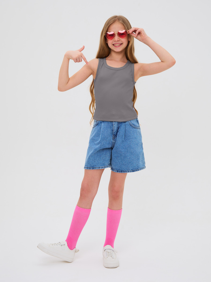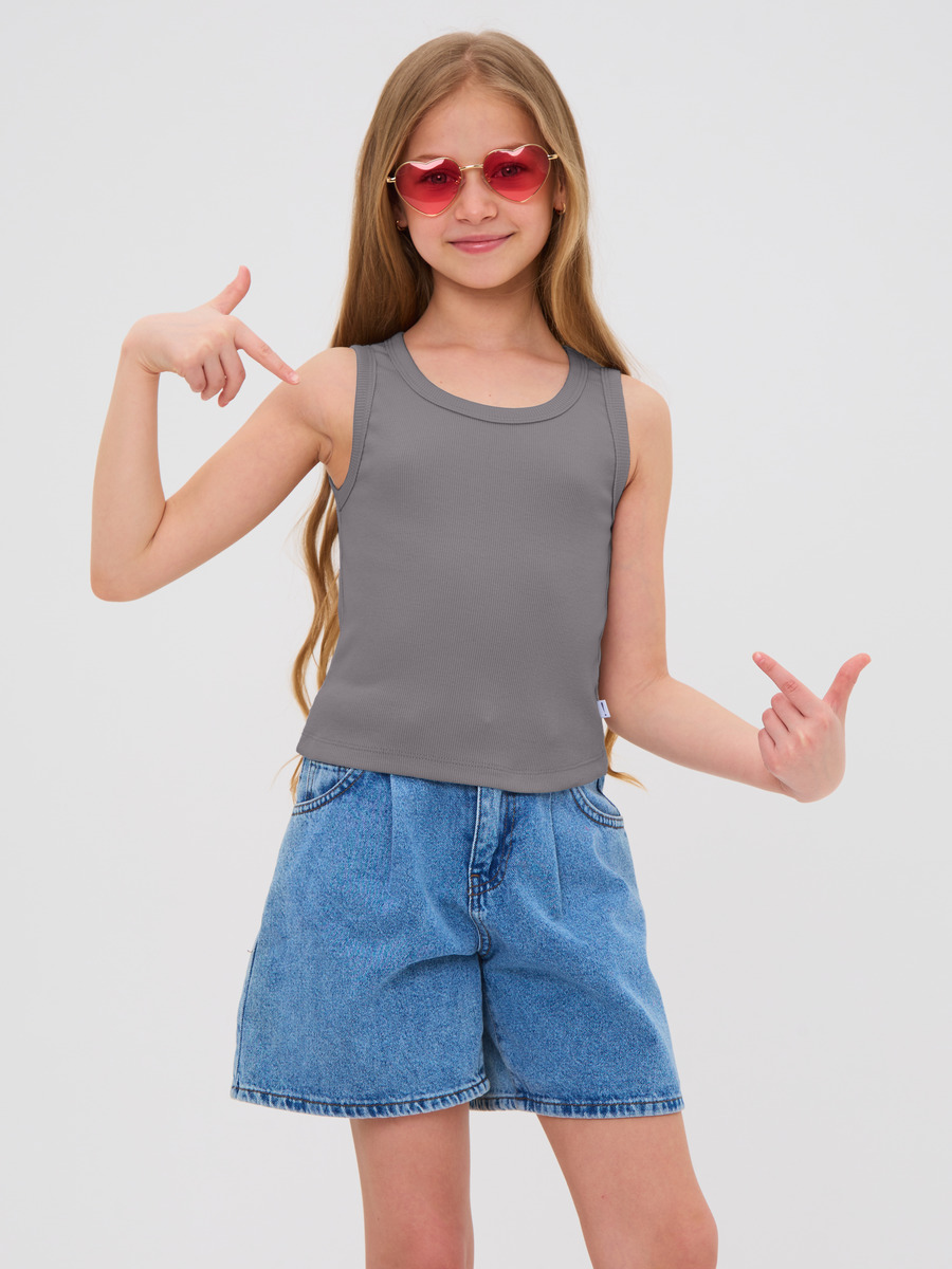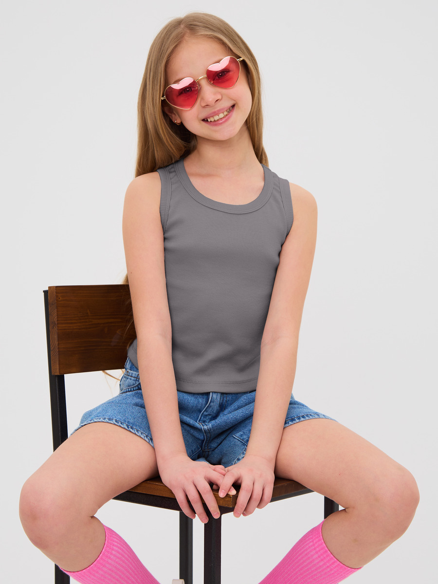 Майка для девочки из кашкорсе, облегающего силуэта чуть ниже талии.