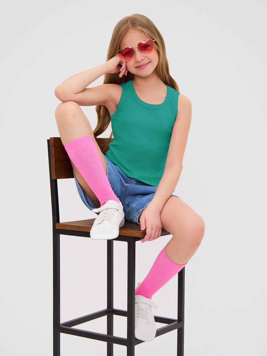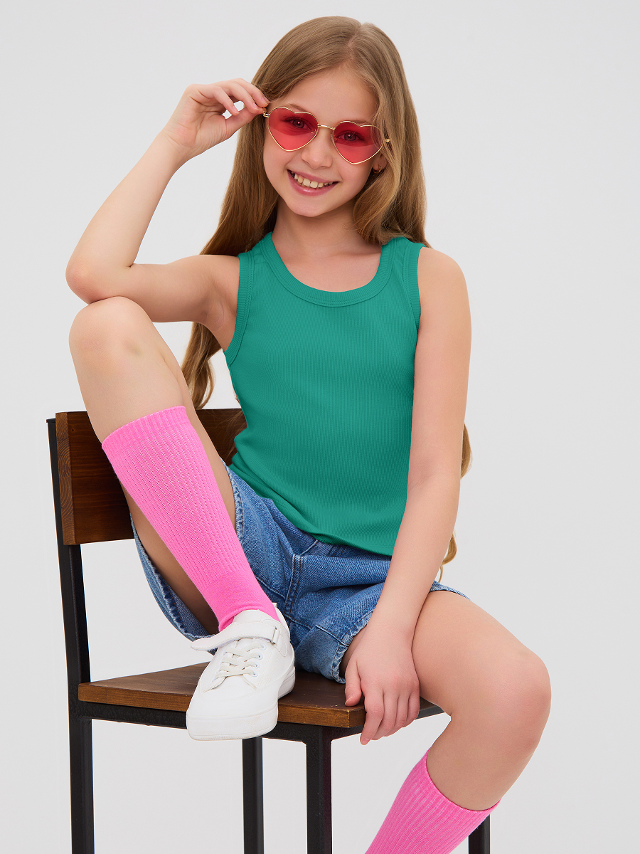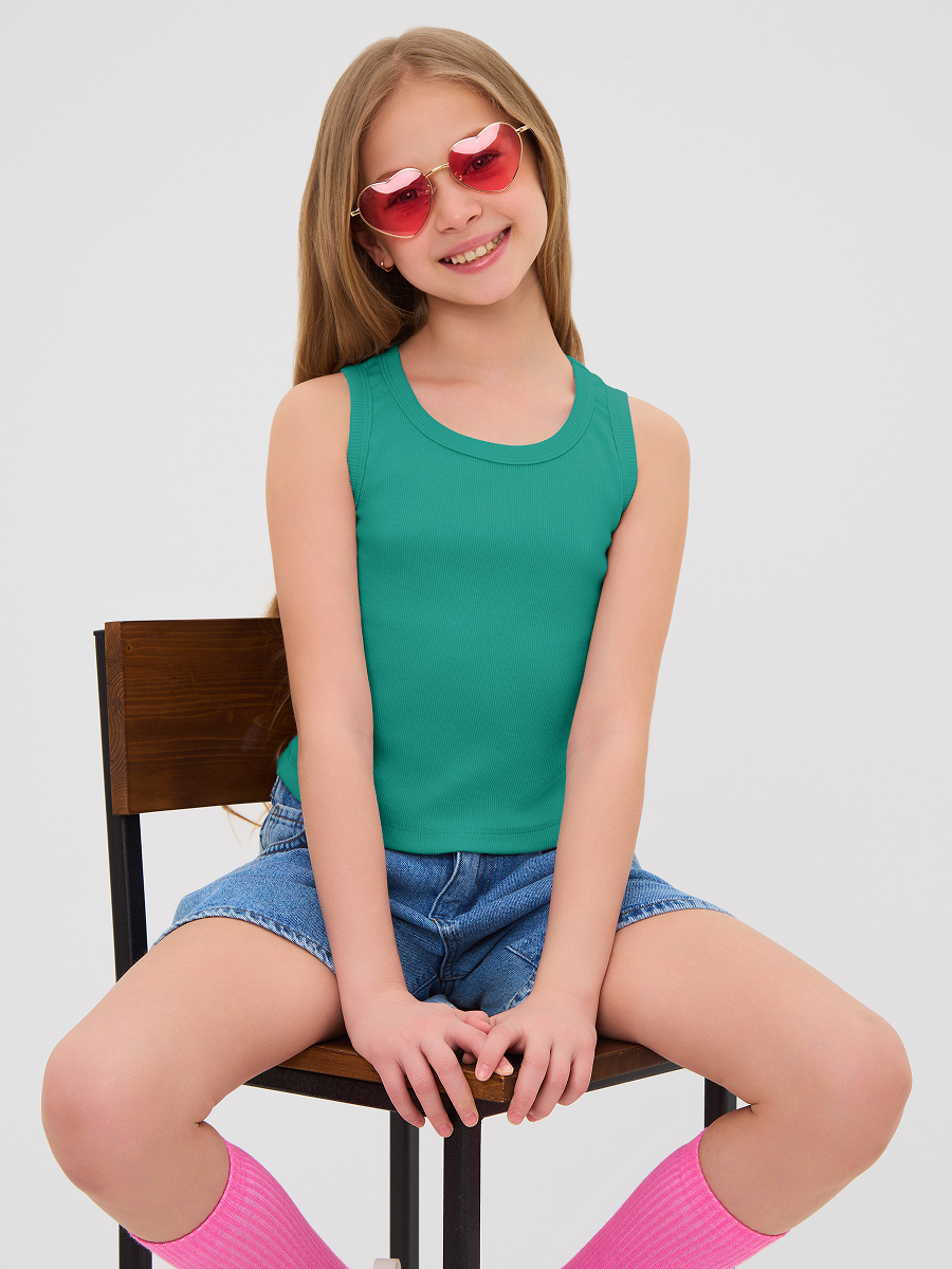 Майка для девочки из кашкорсе, облегающего силуэта чуть ниже талии.
