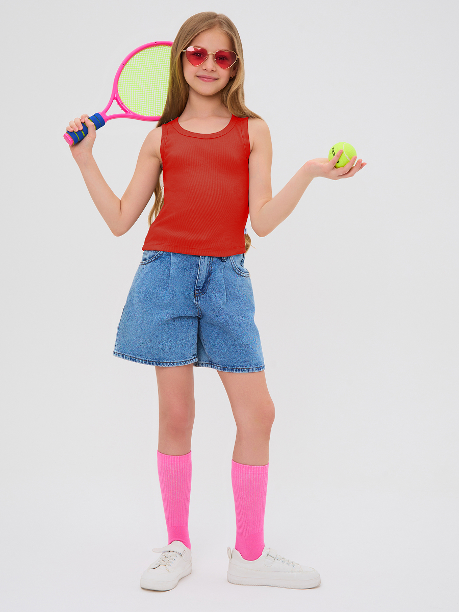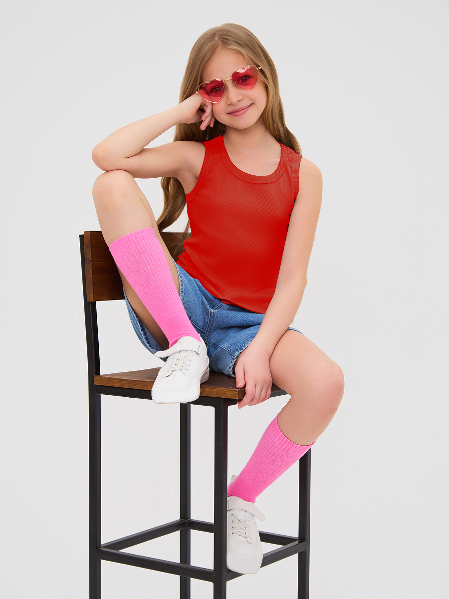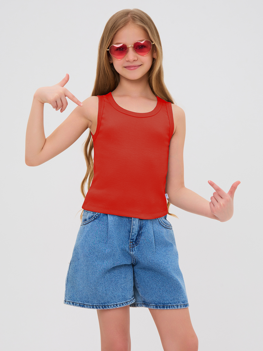 Майка для девочки из кашкорсе, облегающего силуэта чуть ниже талии.
