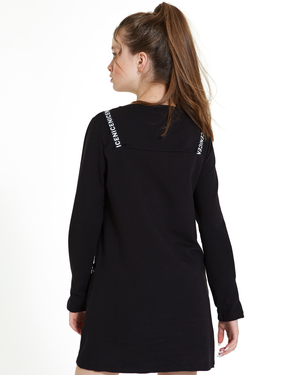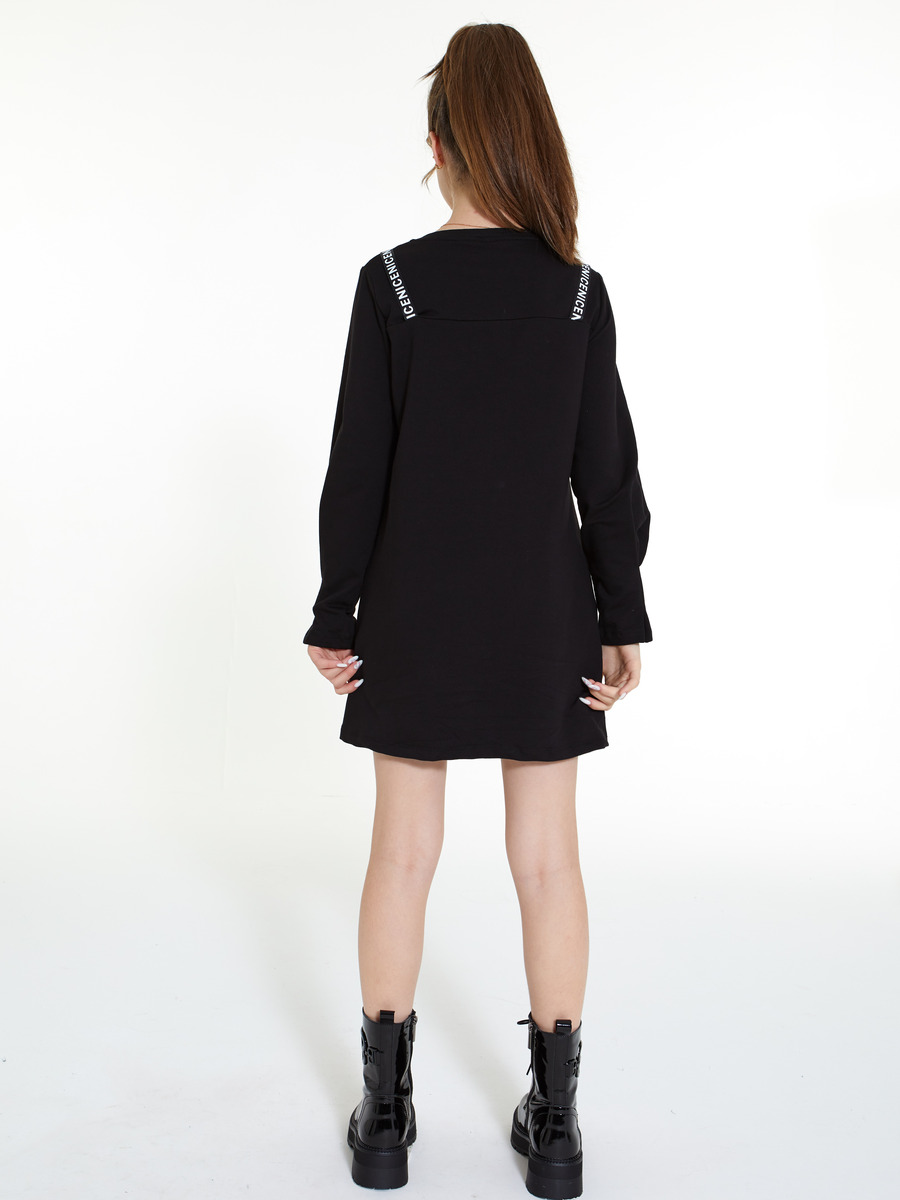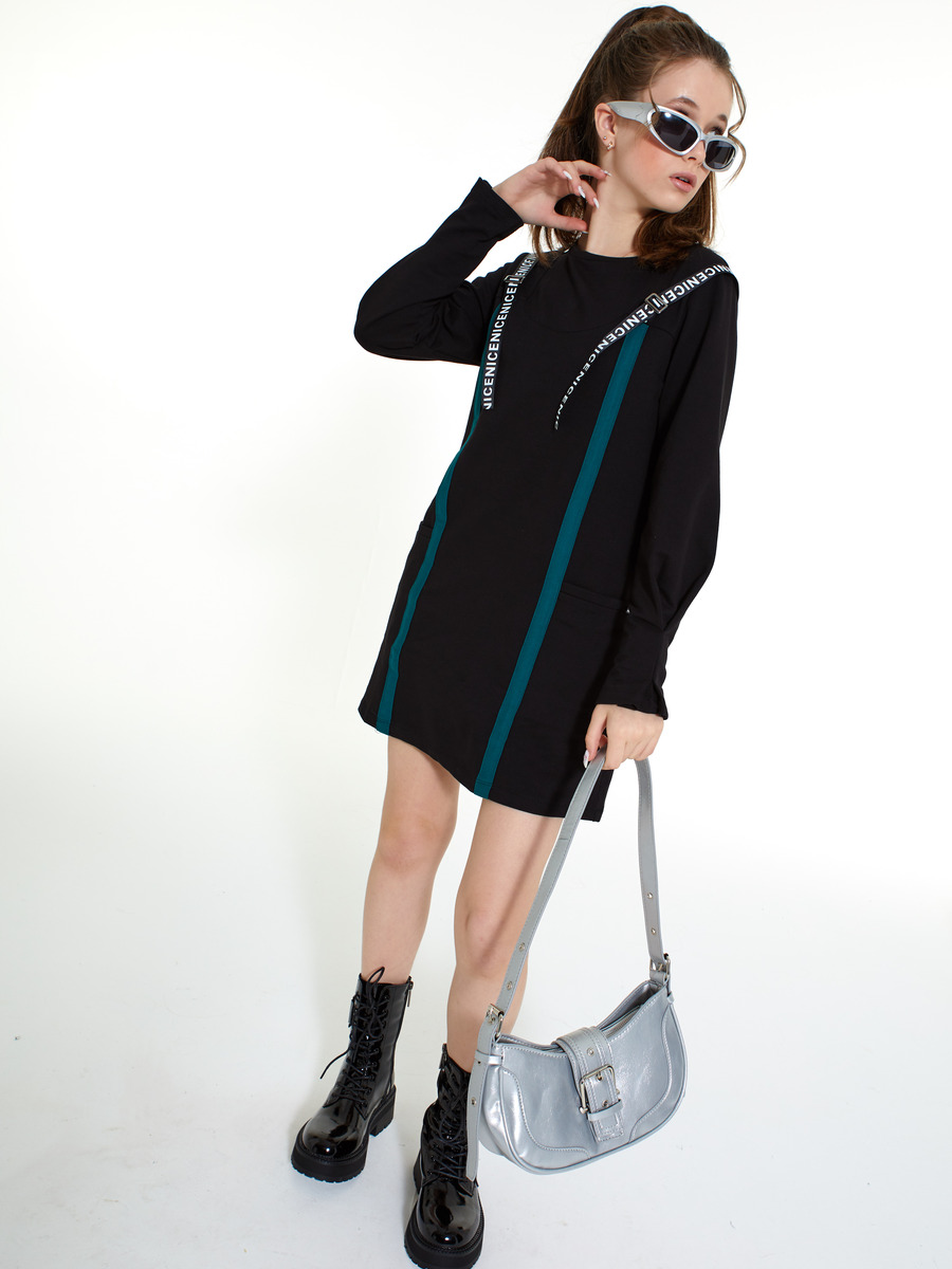 Платье из футера 2-х нитки с лайкой, полуприлегающее с прорезными карманами, настрочными лампасами, декоративными лентами с пряжками, груглая горловина. Длинный рукав в низу со складкой.