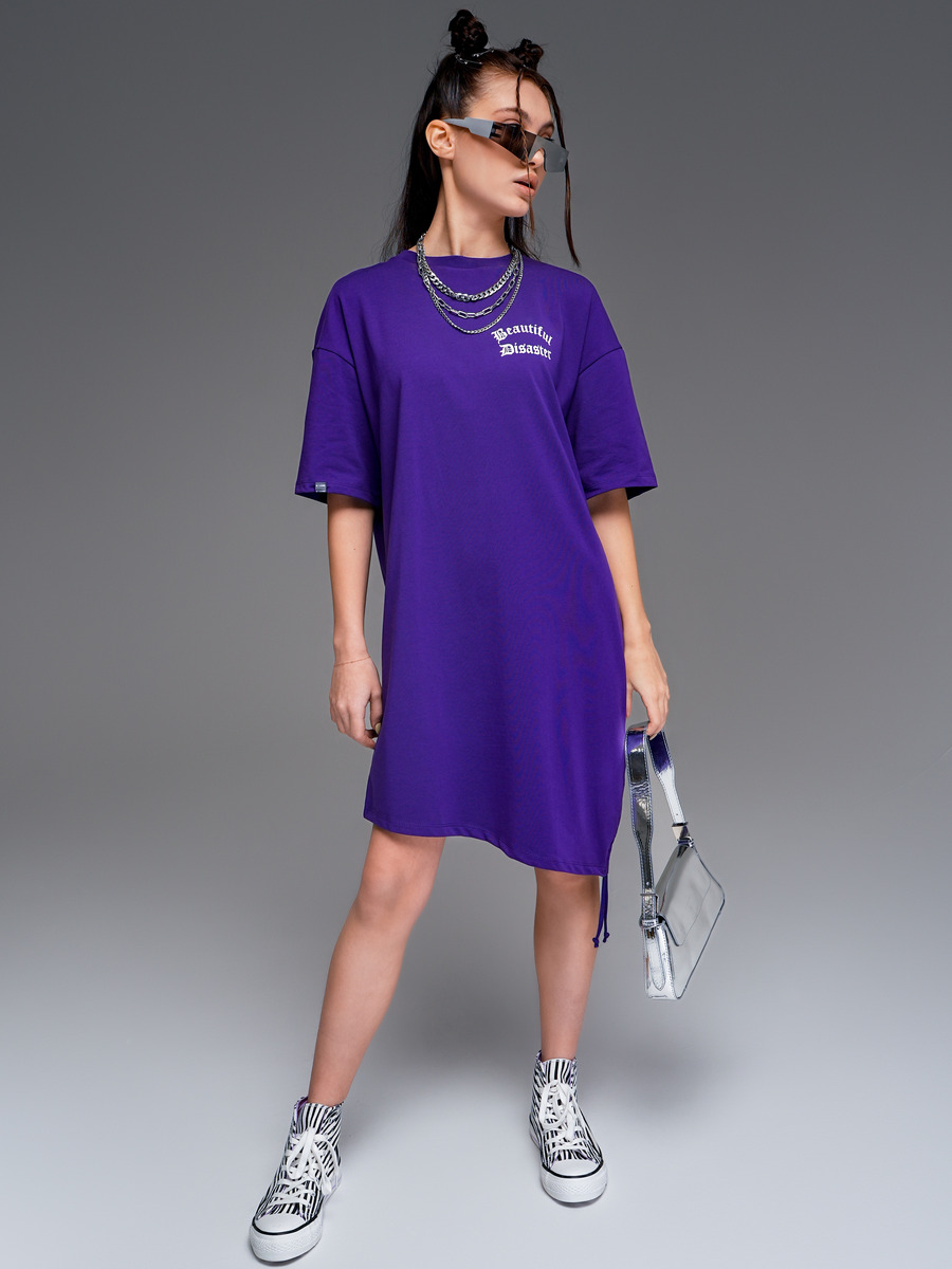 Платье для девочки Оверсай из пермиального качественного хлопкового пенье кулирной глади с лайкрой. Свободного силуэта, с округлой горловиной, со спущенным плечом, с кулиской в левом боковом шве для регулировки длины изделия. Декорировано принтами.