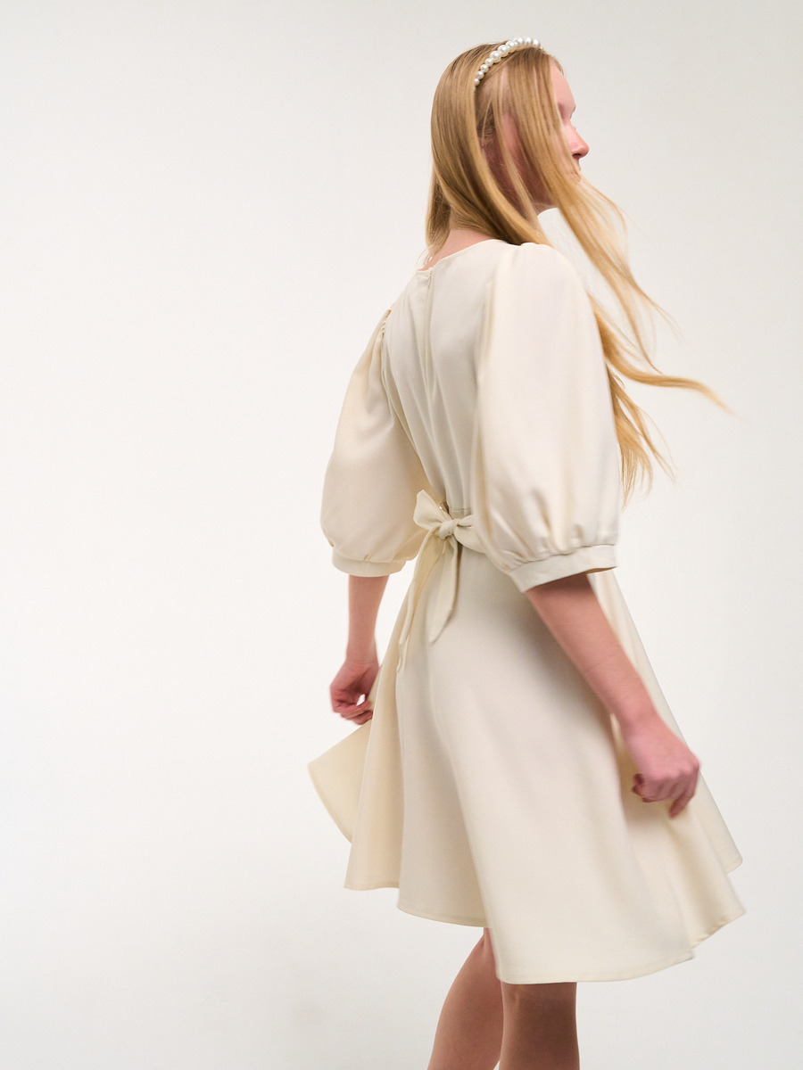 Платье из текстиля средней плотоности. Пояс по талии. Рукава-фонарик. Свободная расклешенная юбка. молочный