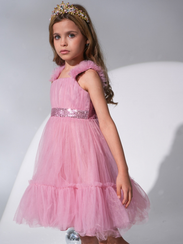 Праздничное платье из фатина идеальный выбор для девочки на выпускной, день рождения, Новый год. Платье воздушное и легкое с пышной юбкой, оборкой по низу юбки и изящными бретелями. Лиф платья выполнен из присборенного фатина, а на спинке присобран резинкой. Оригинальный пояс из пайеток на полочке очень украшает платье, на спинке модный пышный бант из фатина. Платье очень приятно к телу за счет хлопкового подклада. светло-розовый