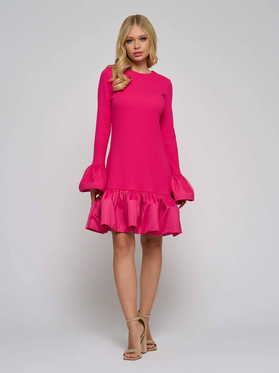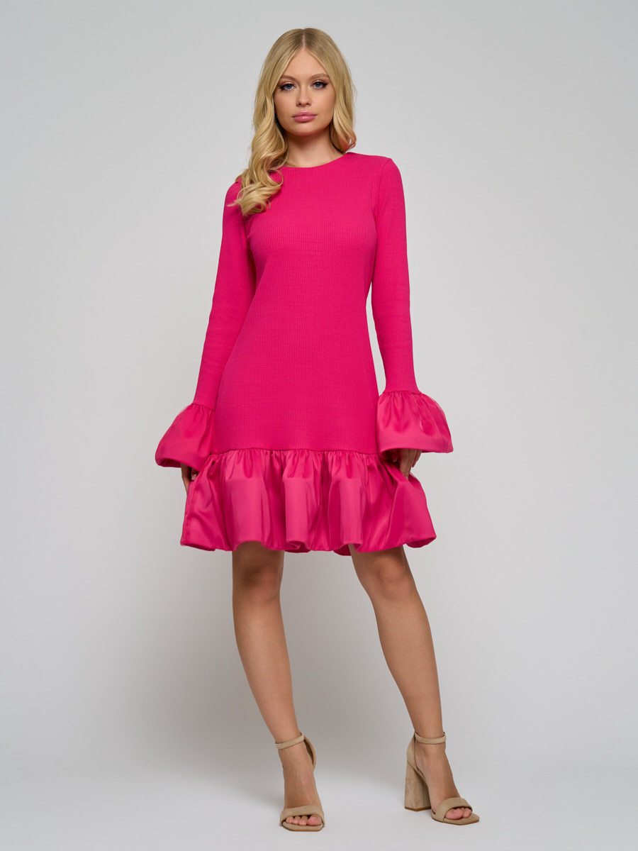 Платье из трикотажного полотна "лапша" прилегающего силуэта, по низу платья и рукавов объемные оборки.