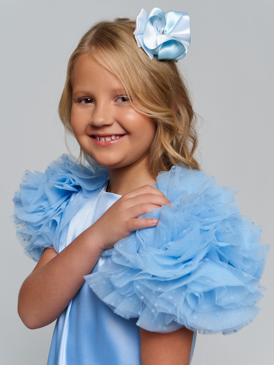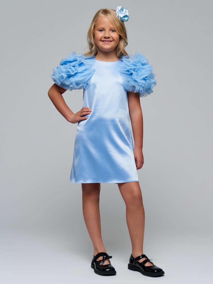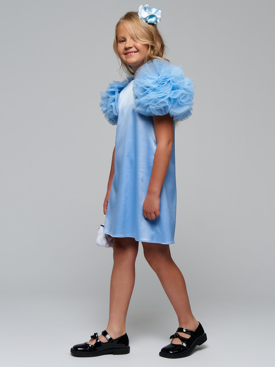 Платье из атласного материала, А образного силуэта с рукавами декорированными сеткой в форме шара.