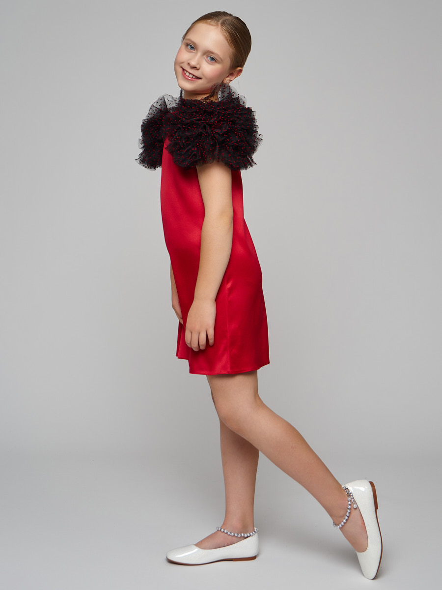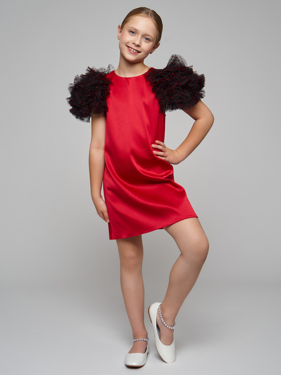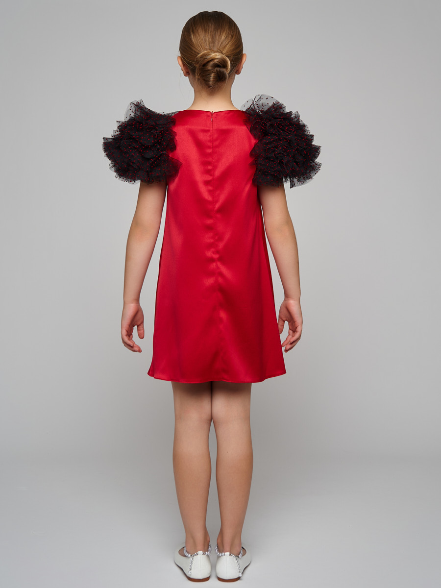 Платье из атласного материала, А образного силуэта с рукавами декорированными сеткой в форме шара.