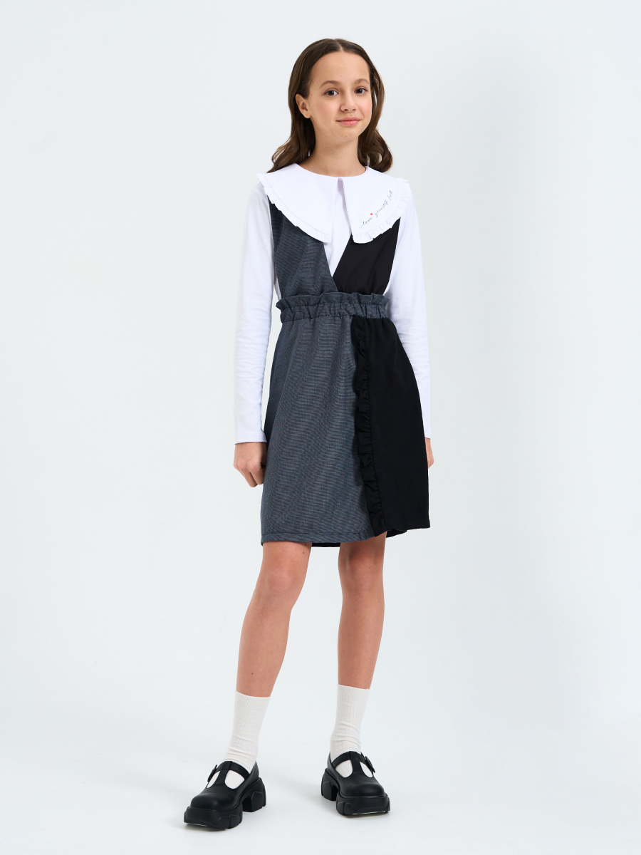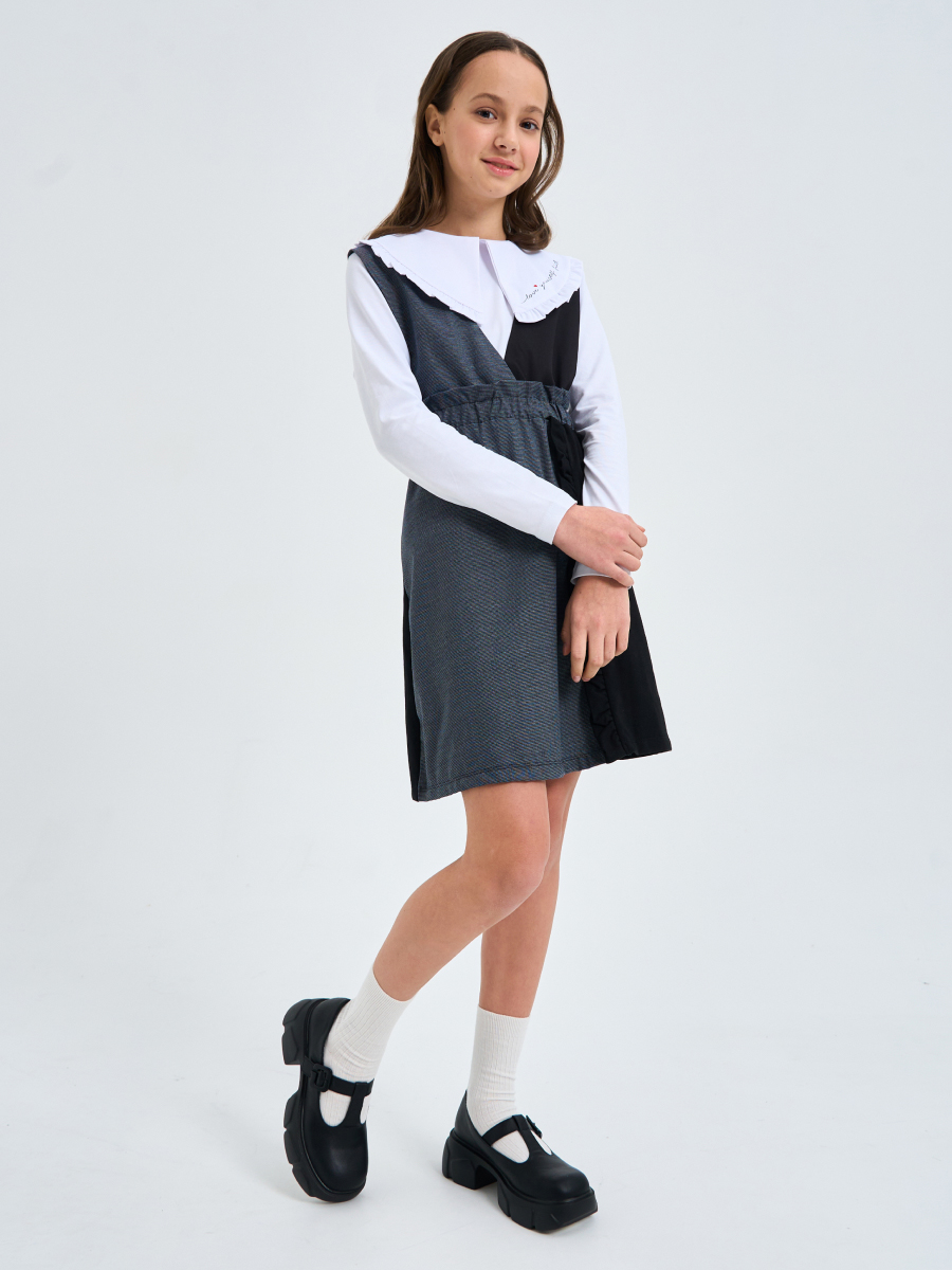 Сарафан для девочки из текстильного и трикотажного полотен, расширенный от талии к низу. Лиф переда обработан подкладкой. Переднее полотнище юбки из 2-частей с притачной рюшей. Пояс с "гребешком", внутри пояса эластичная резиновая тесьма. Декор-брошь.