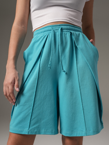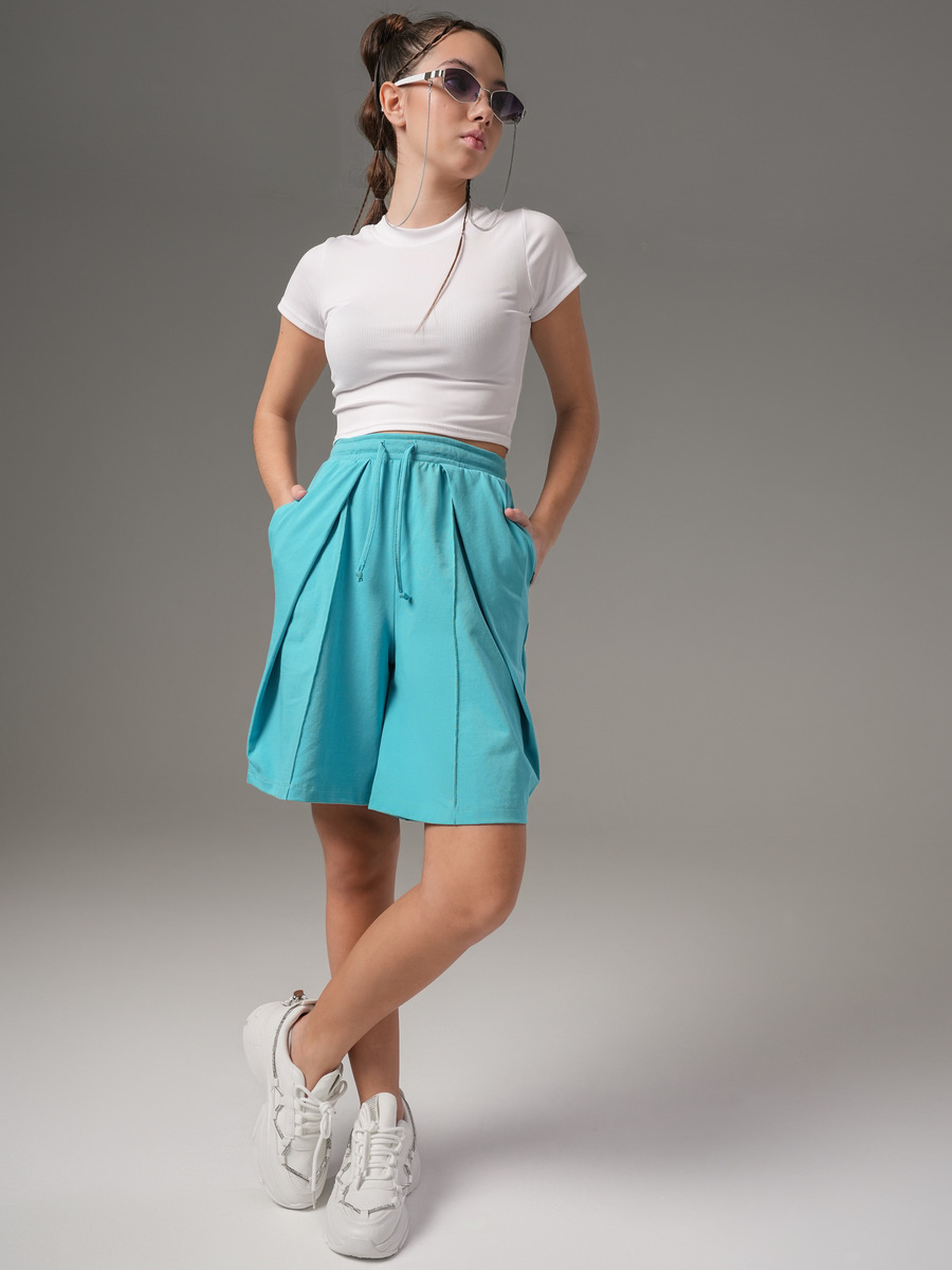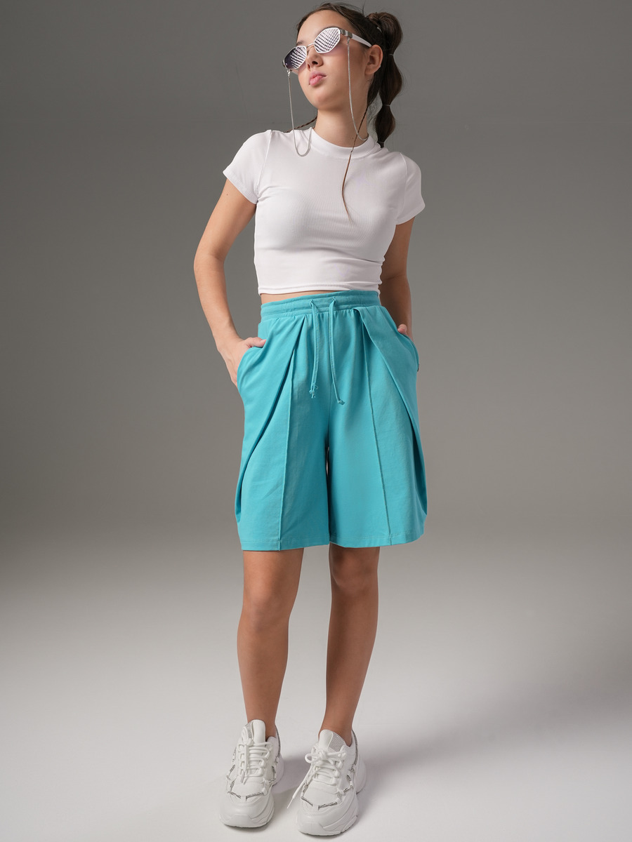 Шорты для девочки из крулирной глади с лайкрой. Прямые-широкие с наклонными складками и стрелками, карманы в швах, пояс на резинке, регулируется шнурком.