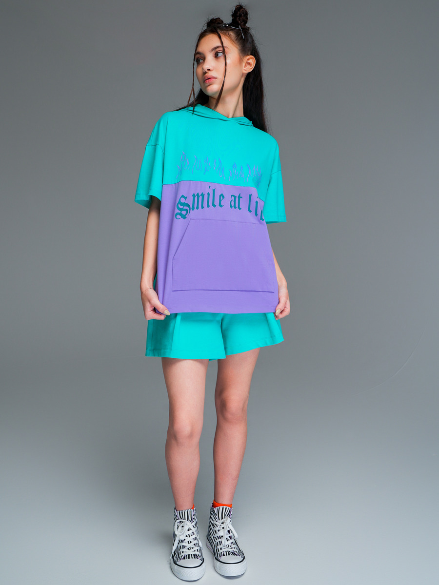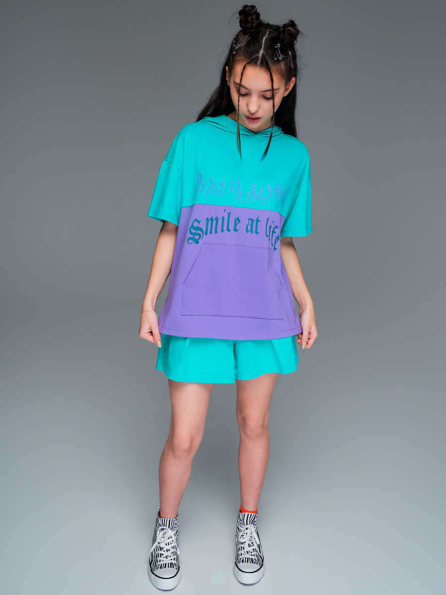 Шорты для девочки из премиального качественного хлопкового пенье футера 2-х нитки, с цельнокройным поясом, задняя часть пояса собрана на резинку. По переду складки, карманы в боковых швах.Съемный пояс с полукольцами.