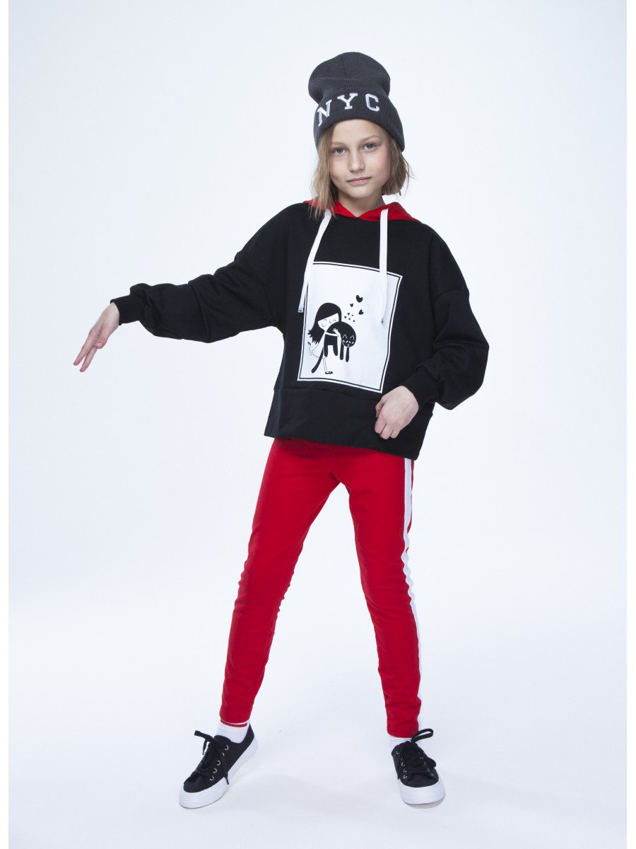 Толстовка свободного силуэта с капюшоном для девочки. На передней части принт. Плечо спущенное, рукав длинный с манжетой по низу. По низу изделия пояс.