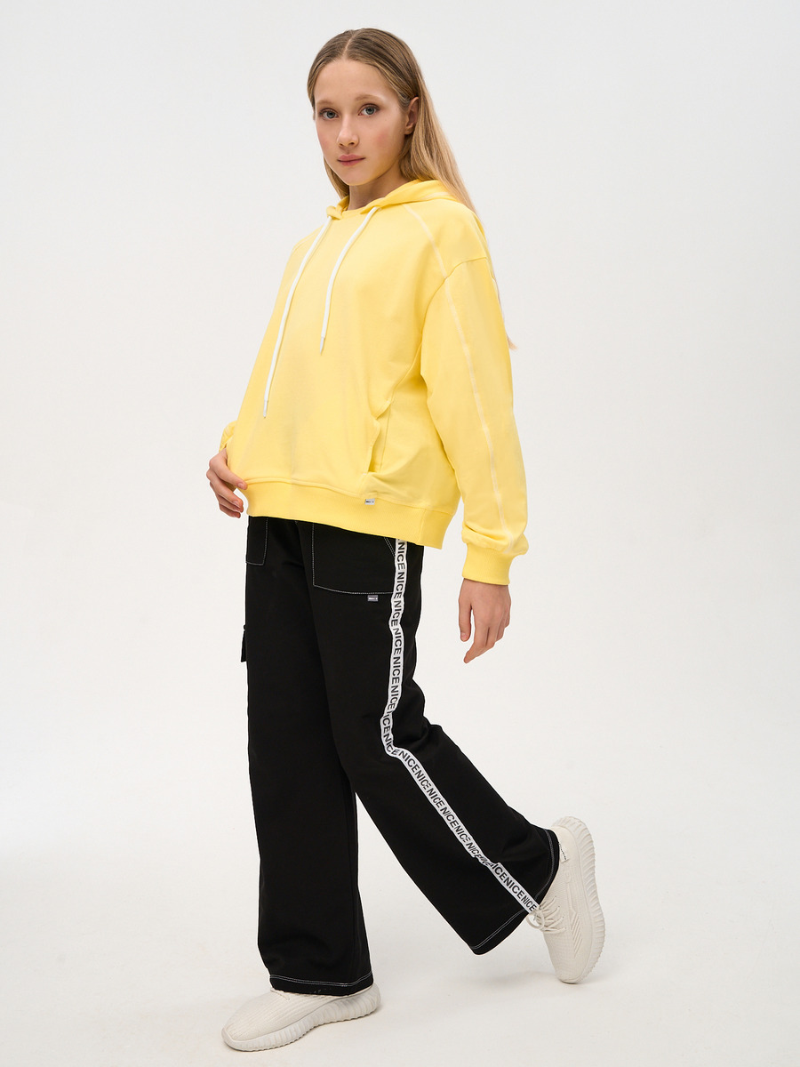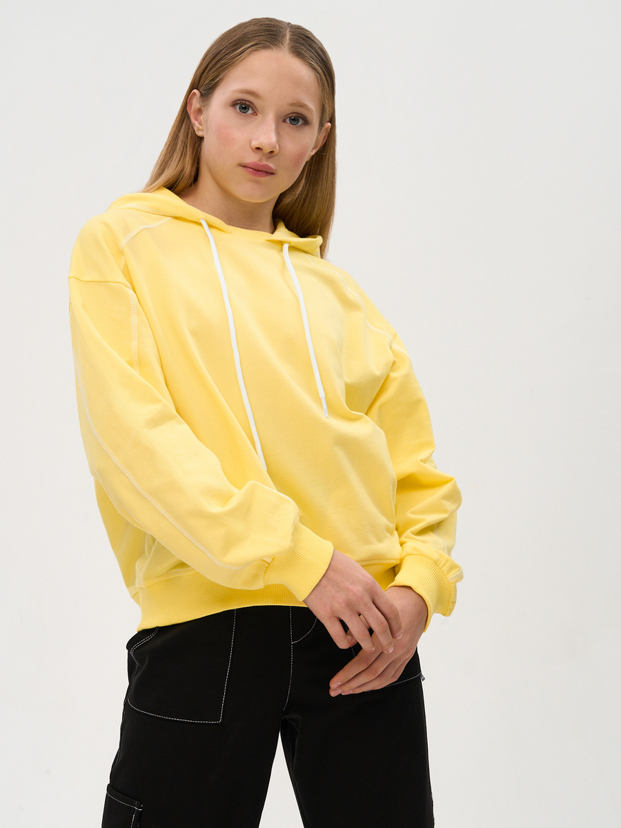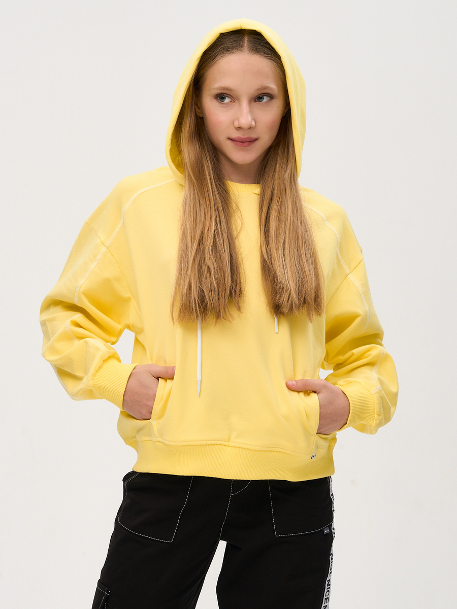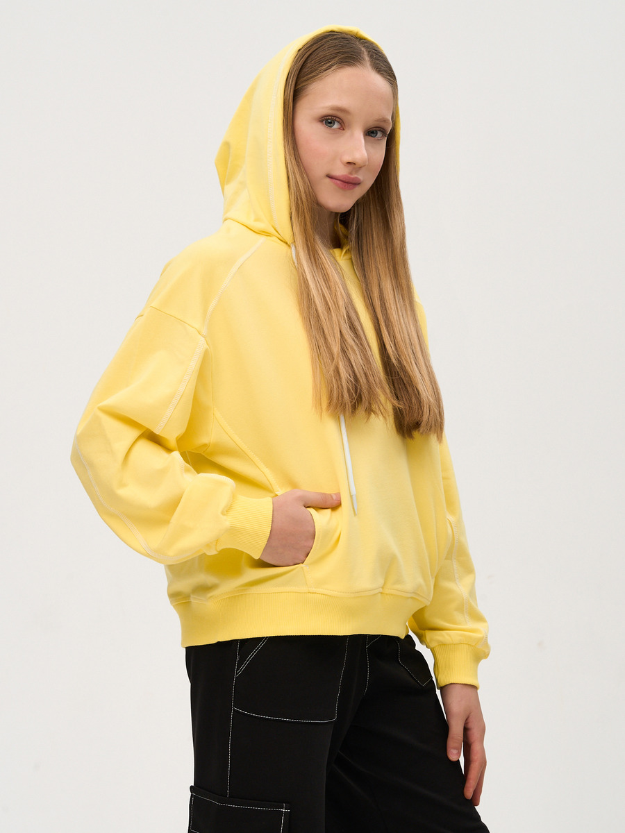 Толстовка для девочки из премиального качественного хлопкового футера 2-х нитки с лайкрой, прямая свободного силуэта на поясе, с планкой по горловине и капюшоном, карманы в рельефных швах спереди, рукава на манжете. Декорирована отделочными контрастными строчками и принтом на спинке.