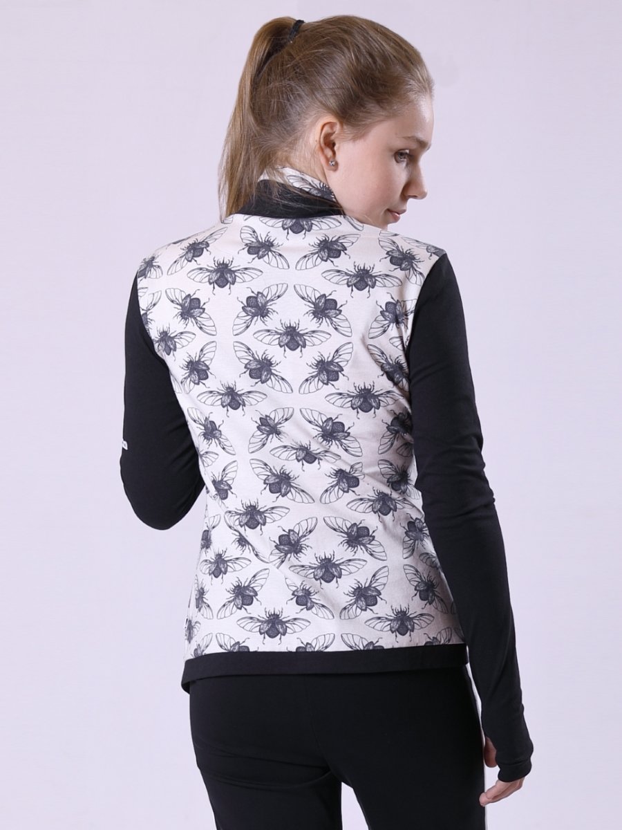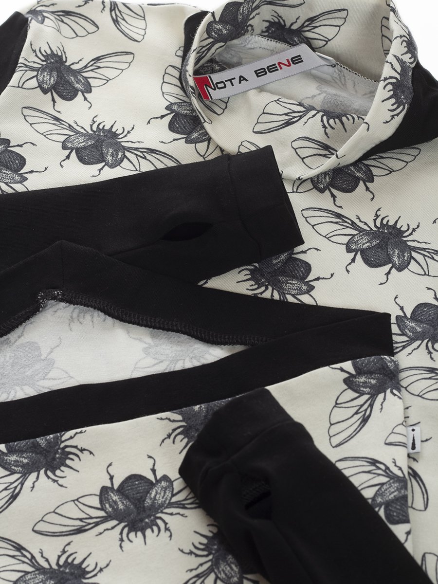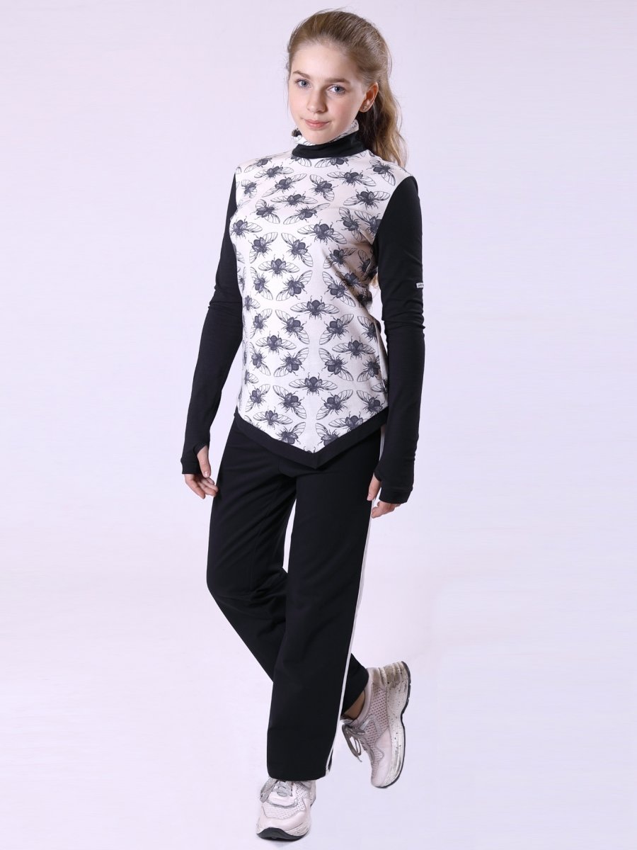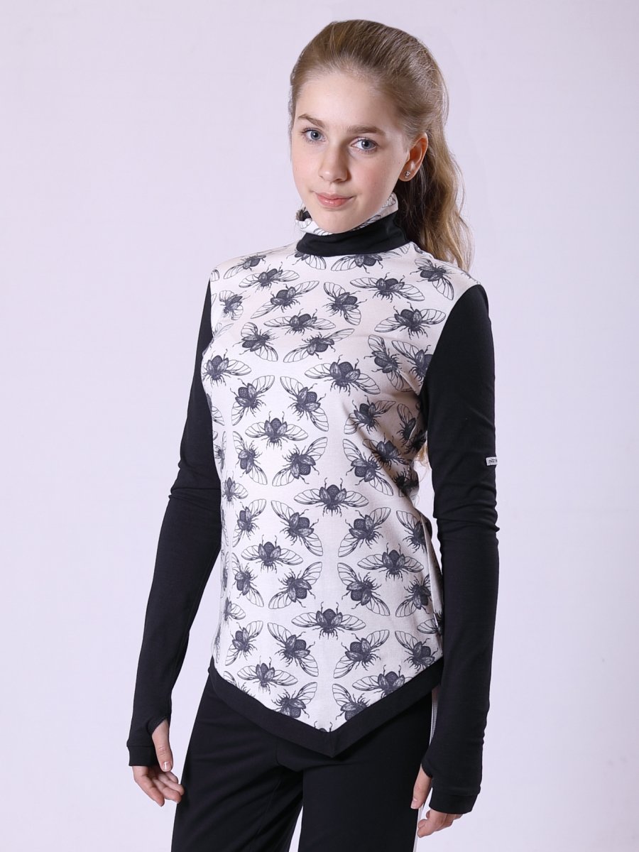 Водолазка для девочки средней длины, прилегающего силуэта, с длинными втачными рукавами, воротником -стойкой, поясом. Рукава с манжетами и отверстием для большого пальца. Низ изделия фигурный. Рукава, пояс и верхний воротник выполнены из полотна контрастного цвета. В качестве дополнительного декора использованы брендовые этикетки и флажки