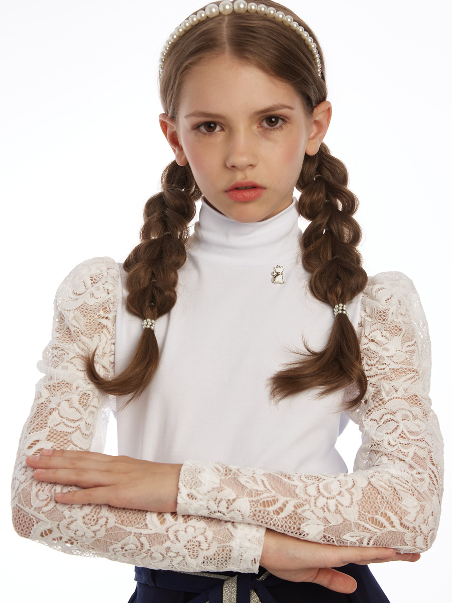 Водолазка для девочки прилегающего силуэта с длинными втачными рукавами. рукава выполнены из эластичного кружевного полотна, перед украшен брошью "кошка". белый