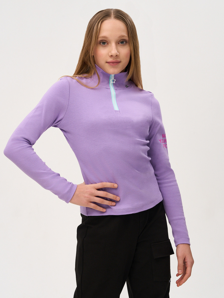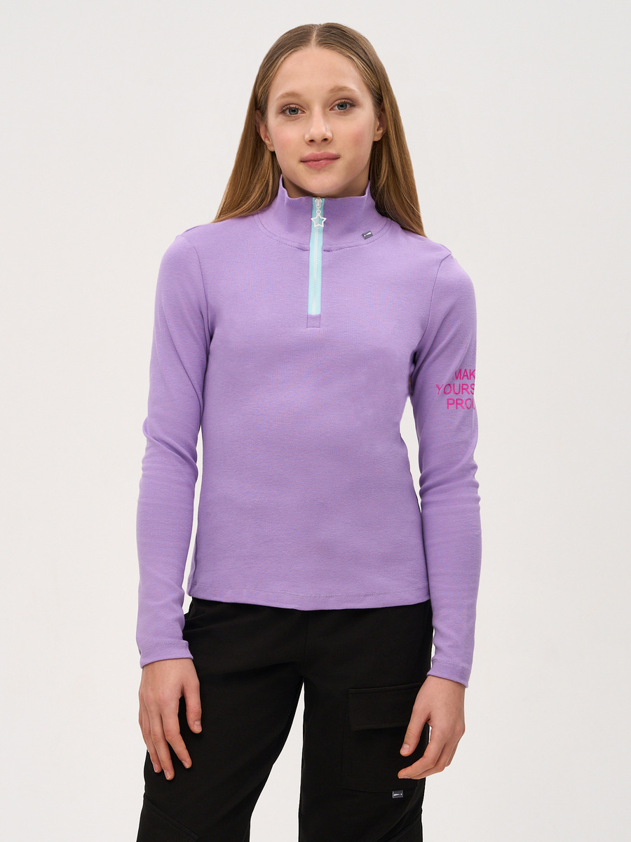Водолазка из рибаны с лайкрой, прилегающего кроя, высокий воротник , длинные рукава, застежка на короткую молнию. Принт на рукаве.