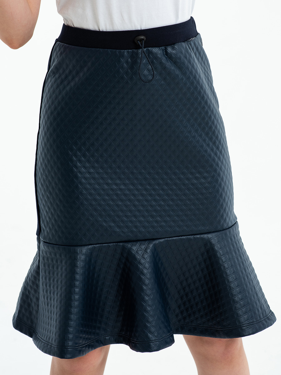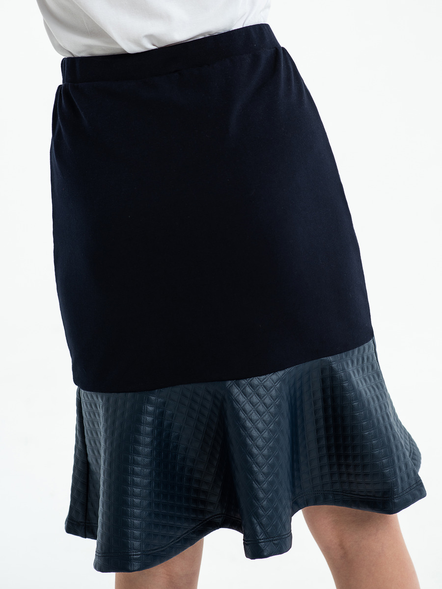 Юбка прилегающего силуэта на поясе с резиновой тесьмой. Низ юбки оканчивается воланом, перед юбки и волан выполнены из экокожи.