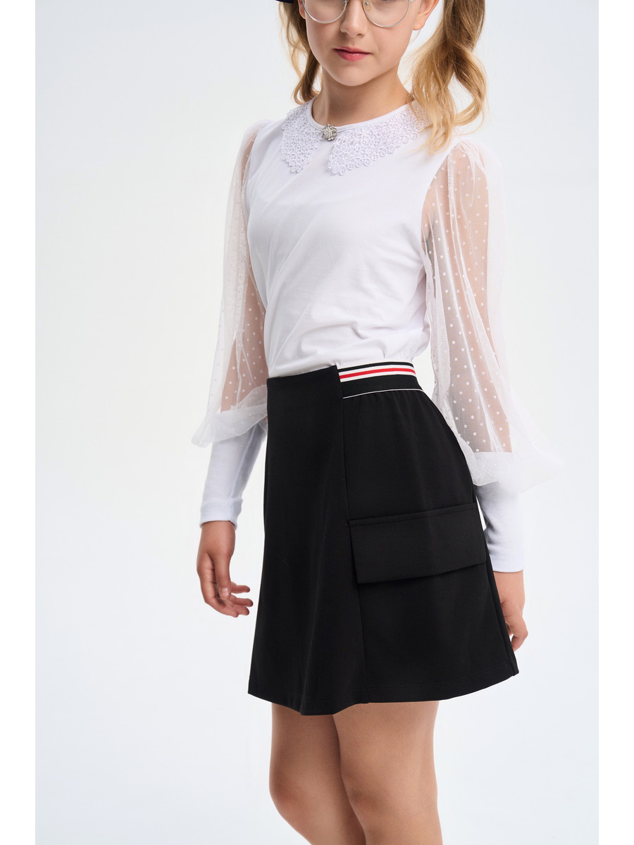 Коллекция школа 2024. Трикотажная Юбка из джерси, хлопок 45% и полиестер 55%.. Юбка для девочки трапецевидного силуэта, длина выше колен, для повседневной носки с рельефами на передней и задней половинках, с накладными боковыми карманами с клапаном..Пояс из декоративной резинки контрастного цвета с полосками, спереди вставка из основного материале джерси. Низ изделия обработан эластичным потайным швом в подгибку. черный