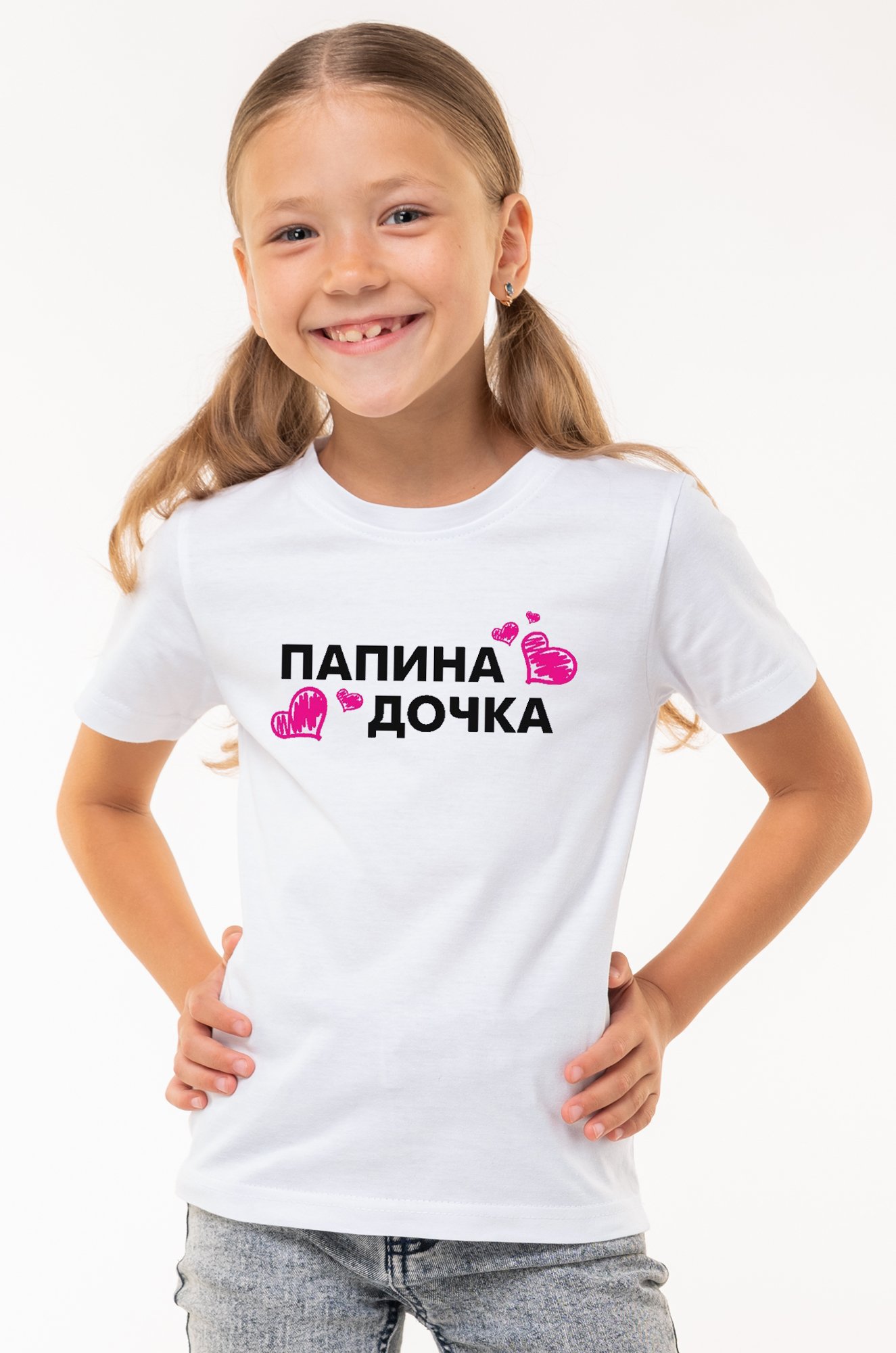 Детская футболка с надписью Папина дочка выполнена из мягкого 100% хлопка. Удобный вырез горловины, короткий рукав и прямой крой делают ее идеальной для любой ситуации. Прикольная надпись с сердечками сделает образ милым и поможет всегда оставаться в центре внимания!