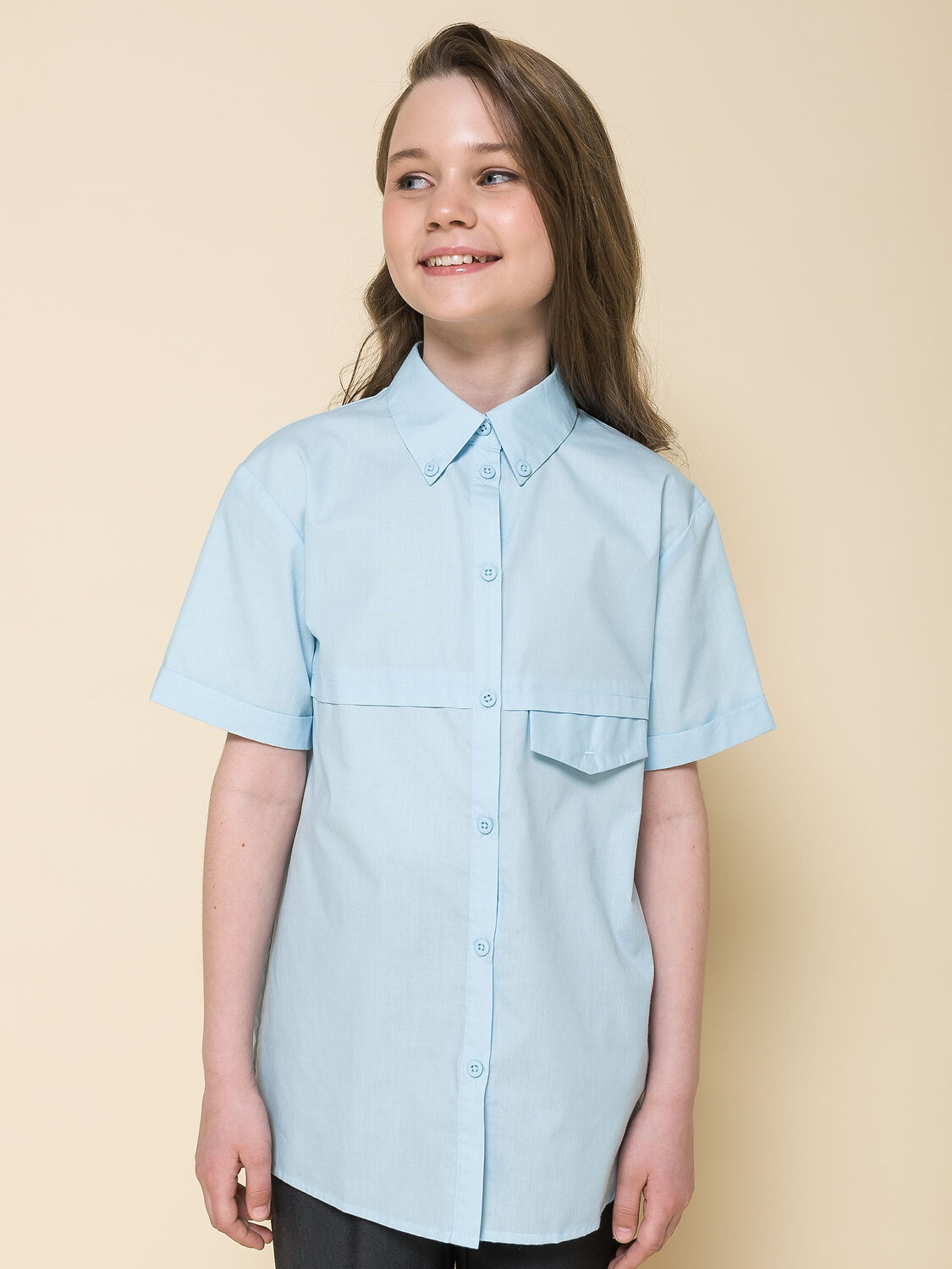 Школьная блузка прямого силуэта для девочки. Преобладающий в составе ткани хлопок делает эту модель мягкой, дышащей и комфортной для ребёнка. Благодаря полиэстеру изделие сохраняет форму и превосходный внешний вид. На спинке кокетка с защипом - свобода движения, комфорт в течение дня. По переду под кокеткой имитация кармана в виде декоративного клапана – актуально и стильно. Воротник украшают декоративные пуговицы — изюминка модели. Рукав с отворотом - оригинально. Практичная и универсальная модель благодаря лаконичному дизайну великолепно сочетается с различными брюками и юбками. Отличный вариант детской блузки для школы.