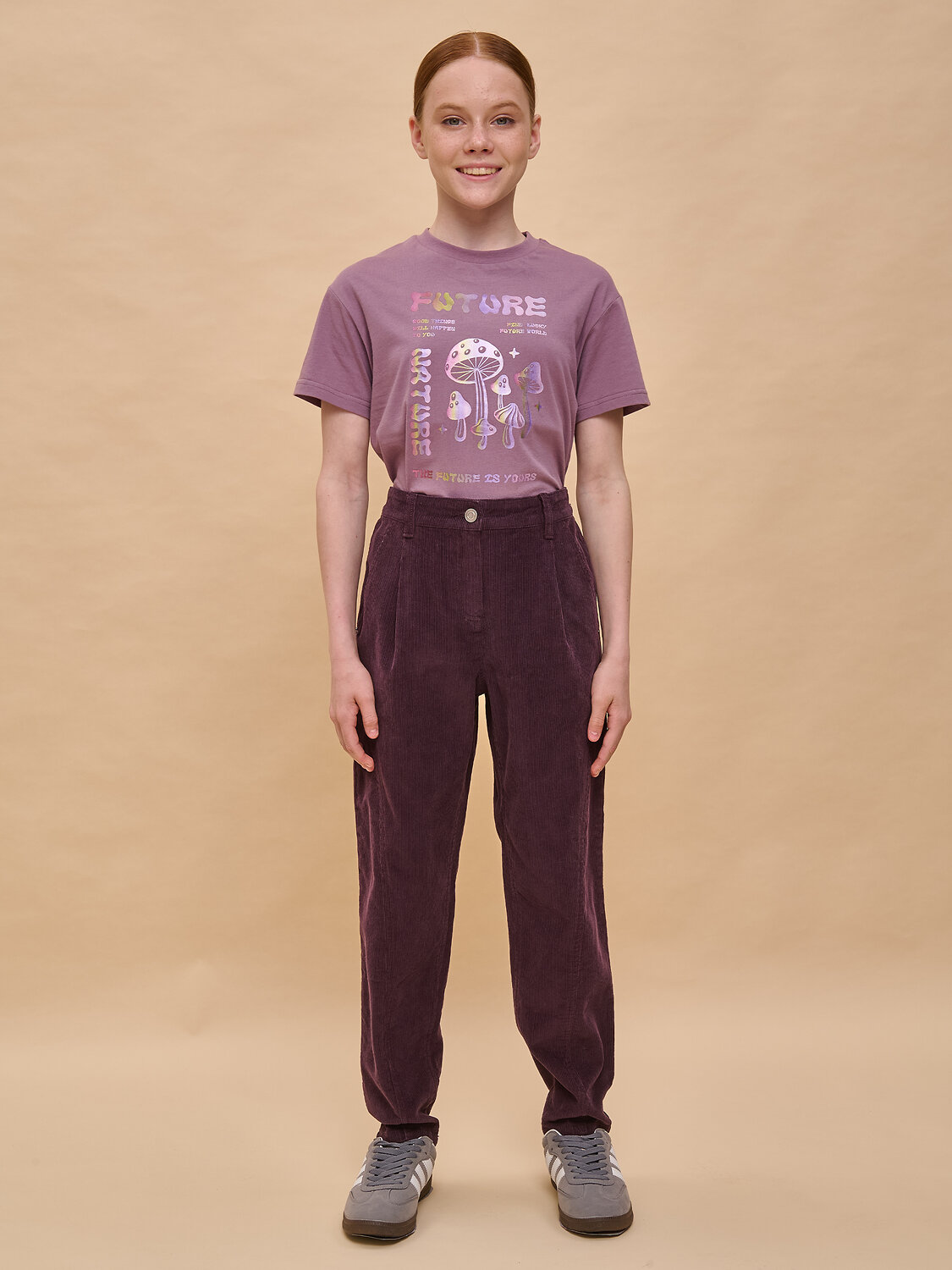 Вельветовые слоучи с высокой посадкой для девочки. Стильная современная модель – идеально сидит, отлично носится, всегда аккуратно выглядит. 100% хлопок в составе – ткань мягкая, дышащая, приятная на ощупь, прочная и простая в уходе. Застежка на гульфик и внутренняя резинка в поясе на спинке – брюки отлично сидят и не спадают, ремень не требуется. Большой объем в бедрах и сужение книзу декоративными вытачками для свободы движений – легко быть активной каждый день. Слоучи комбинируются с футболкой, водолазкой, лонгсливом – одинаково хорошо с заправленной одеждой и навыпуск.