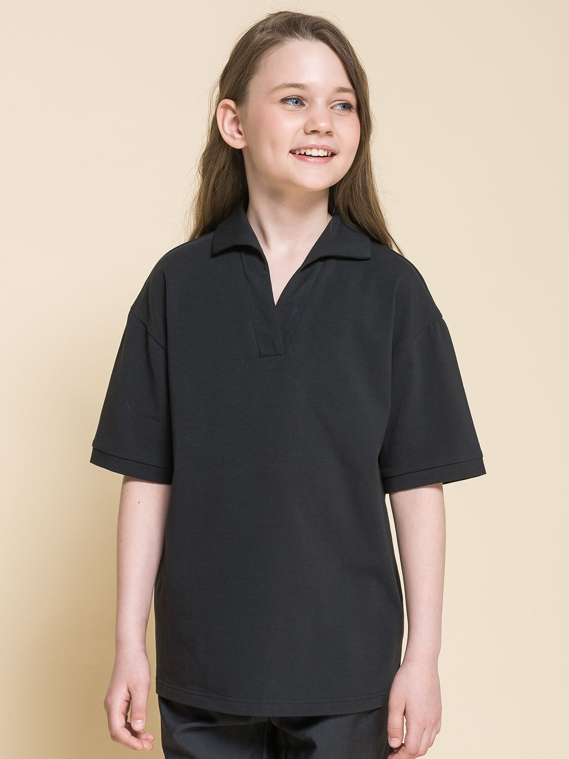 Футболка свободного силуэта со спущенным плечом для девочки. В составе ткани преобладает хлопок — изделие мягкое, дышащее и приятное на ощупь. Эластан помогает сохранять форму даже после частых стирок. Мягкая V-образная горловина дополнена отложным воротником без застёжки – удобно надевать и снимать. Благодаря свободному силуэту эта модель подходит девочкам с разными типами фигуры. Футболка не станет малой в течение долгого времени, даже если ребёнок заметно подрастёт. Изделие лаконичного дизайна легко сочетается как с брюками, так и с юбкой, сарафаном. Отличный выбор школьной одежды для девочек.