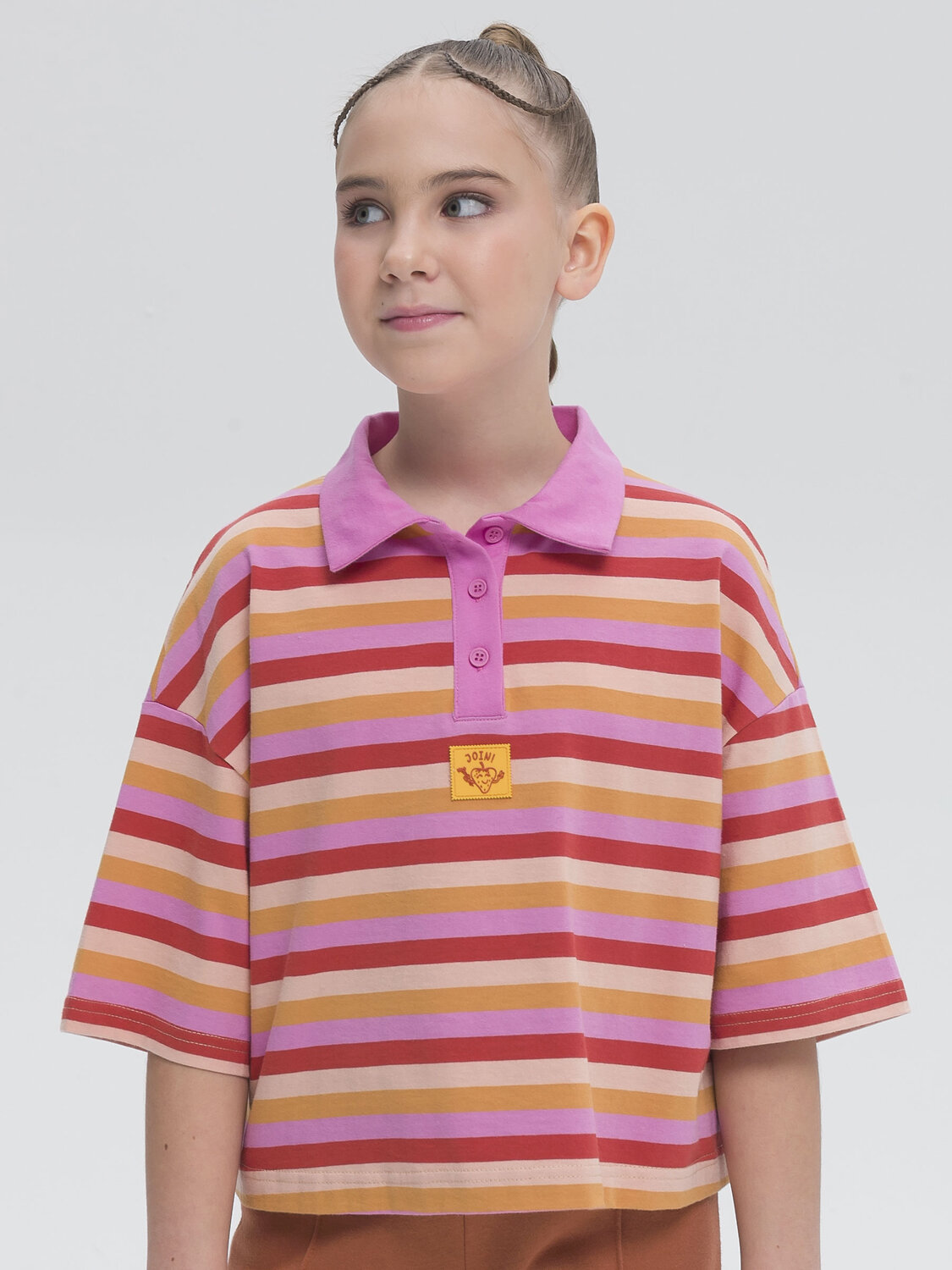 Кроп-топ (поло) оверсайз-силуэта для девочки. Кроп-топ — один из актуальных летних трендов. Модель со спущенным плечом и удлинённым рукавом выполнена из трикотажного полотна в яркую вытканную горизонтальную полоску. Это не принт, полоски не поблёкнут от многочисленных стирок. Состав ткани — хлопок 100%. Благодаря этому поло мягкое, комфортное и приятное на ощупь. Практичный оверсайз-силуэт позволит носить топ продолжительное время. Даже если ребёнок заметно подрастёт, он не станет малым. Модель украшена симпатичной и приятной на ощупь резиновой нашивкой под планкой с пуговицами. Кроп-поло отлично сочетается с шортами и леггинсами.